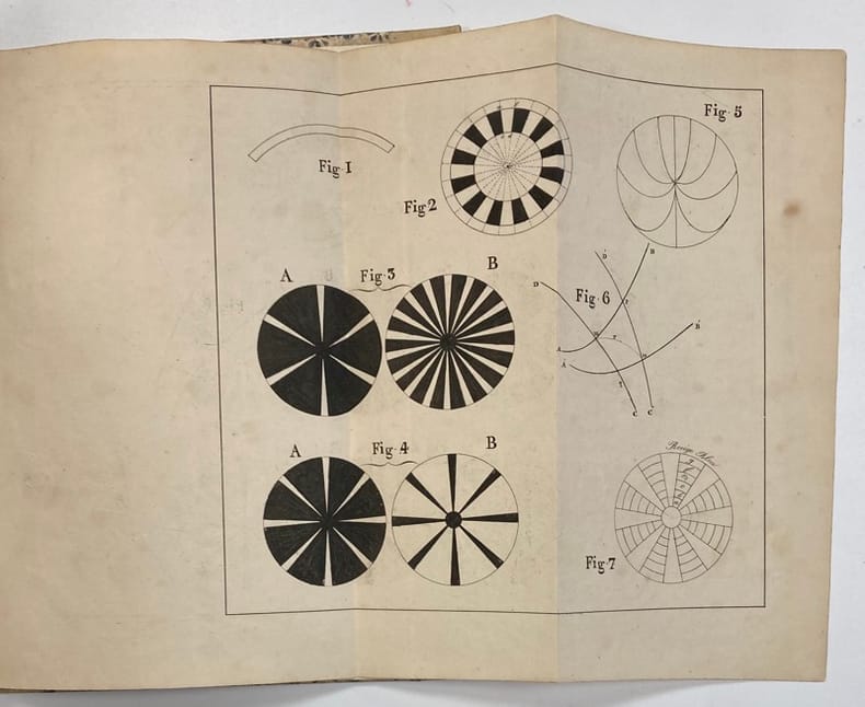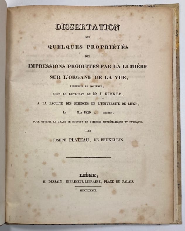Thèse du mathématicien et physicien bruxellois Joseph Plateau (1801-1883), qu’il présente à la faculté des sciences de l’université de Liège en mai 1829 et illustre d’une planche dépliante contenant 7 figures représentant des disques rotatifs.Le sujet choisi par Plateau préfigure déjà ses nombreux et précieux travaux sur la persistance rétinienne, et donne lieu à ses premières expérimentations lors desquelles, par une fixation prolongée du soleil, il perdra la vue temporairement avant de devenir aveugle quelques années plus tard.Par un système de disque rotatif contenant 2 couleurs, il évalue approximativement la durée de persistance rétinienne à 1/3 de seconde, en déduit certains phénomènes d’illusion d’optique et d’anamorphoses. Il perfectionnera plus tard ce système de disque rotatif en « phénakistiscope », premier appareil optique créant l’illusion du mouvement, et précurseur du cinéma.Rousseurs.