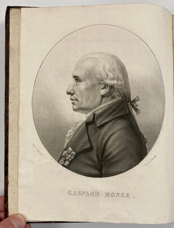 Edition originale de cette monographie de Gaspard Monge (1746-1818), mathématicien français à l’origine de la création de l’école polytechnique, réalisé par un de ses élèves Charles Dupin en hommage posthume à son Maître.Portrait-frontispice de Gaspard Monge. Une liste des souscripteurs au monument érigé en son honneur se trouve en fin d’ouvrage.Une édition in-8 paraitra la même année, sans le portrait mais avec 5 planches. Mouillures. Feuillets intervertis entre p. 97 et 104. Partie supérieure du dos restaurée.
