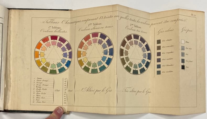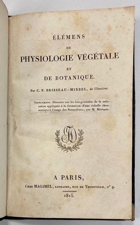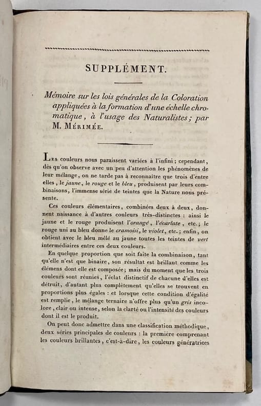 Mémoire de 15 pages paru en supplément de l’ouvrage: Élémens de physiologie végétale et de botanique, de C.F. Brisseau-Mirbel, dont on a gardé ici la page de titre découpée avec titre de l'extrait contrecollé. Il est illustré d’une planche dépliante coloriée au pochoir représentant des tableaux chromatiques comprenant 83 teintes auxquelles toutes les couleurs peuvent être comparées. (Planche 72 de l’ouvrage d’origine).Mérimée (1757-1836), à la fois peintre et chimiste, reprend ici l’ensemble des principes du cercle chromatique qu’il condense et applique au domaine de la botanique.Quelques rousseurs plus marquées sur la page de titre.