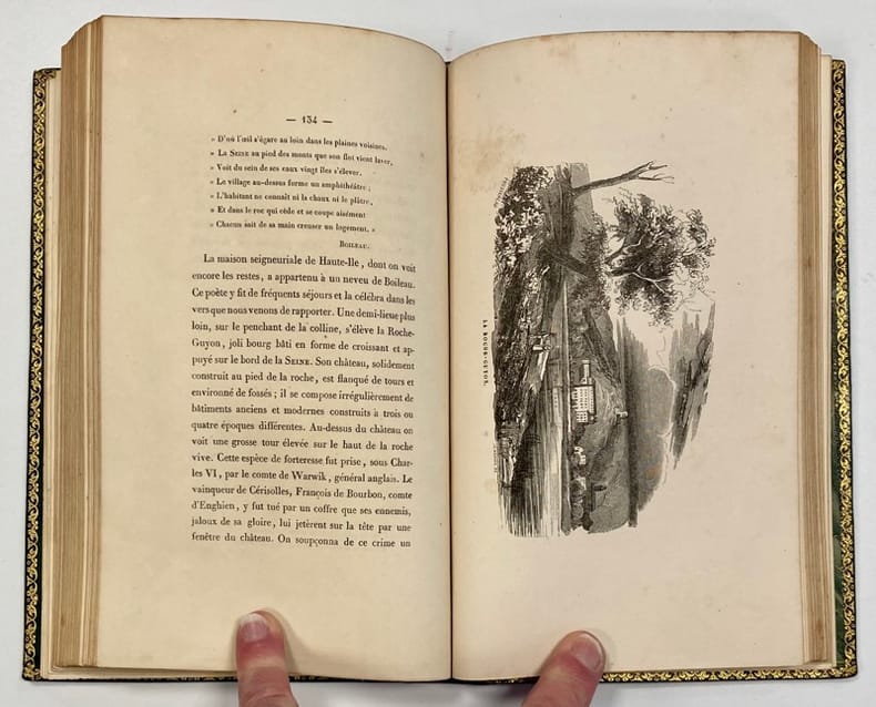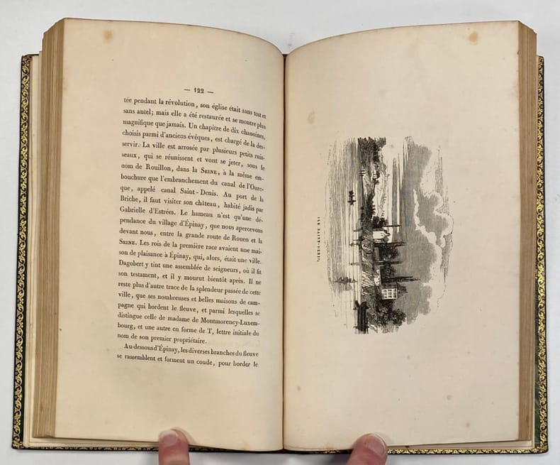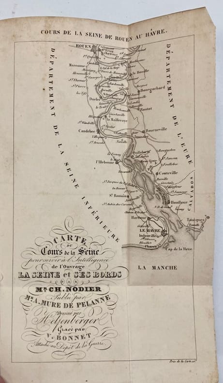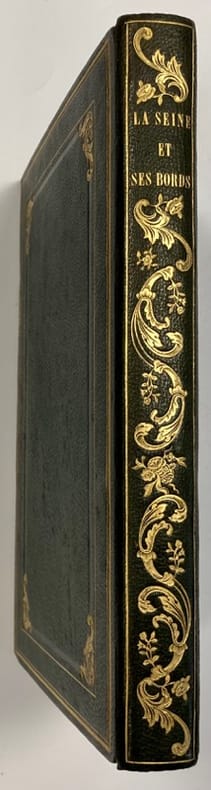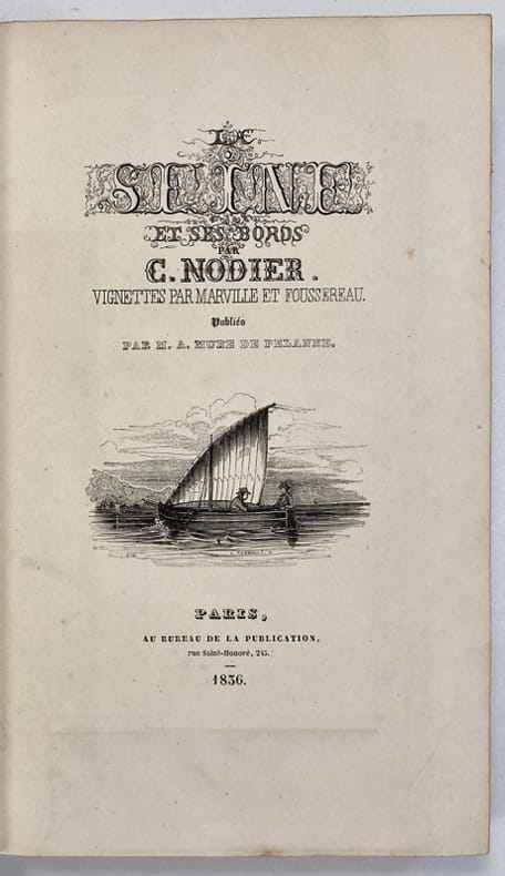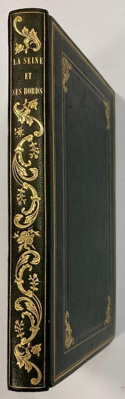 Edition Originale. Illustré de 54 gravures sur bois et 4 cartes de la Seine. Au bureau de la Publication, Paris, 1836, 192 pages + gravures hors texte et cartes. Reliure demi-cuir maroquin brun. Tête dorée. Couvertures d'origine et dos conservés. Vignettes par Marville et Foussereau, table des villes, bourgs et villages situés sur les bords de la Seine. A toutes marges. Le petit prix est justifié du fait qu'il manque une gravure (Caudebec).