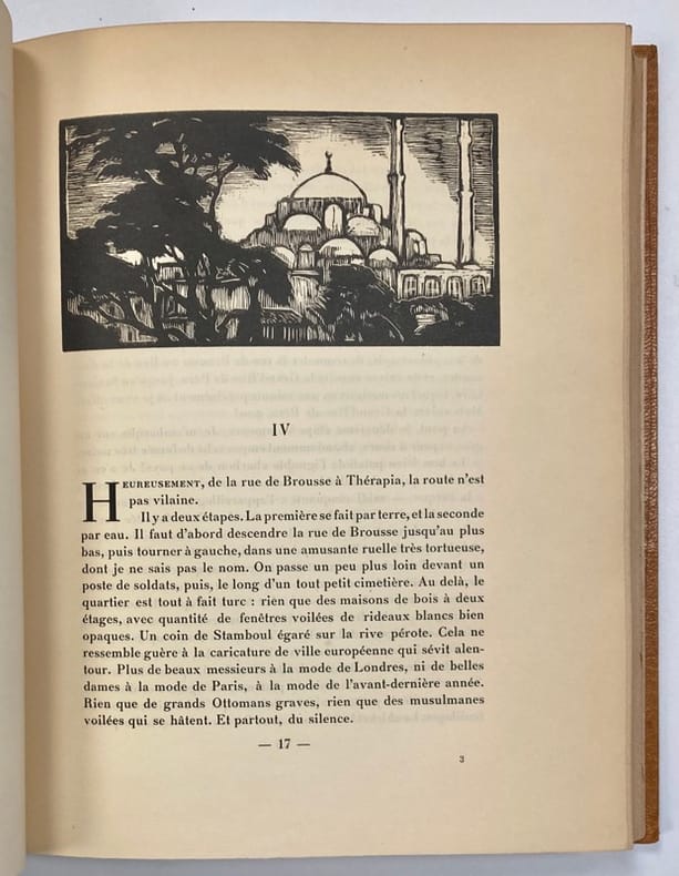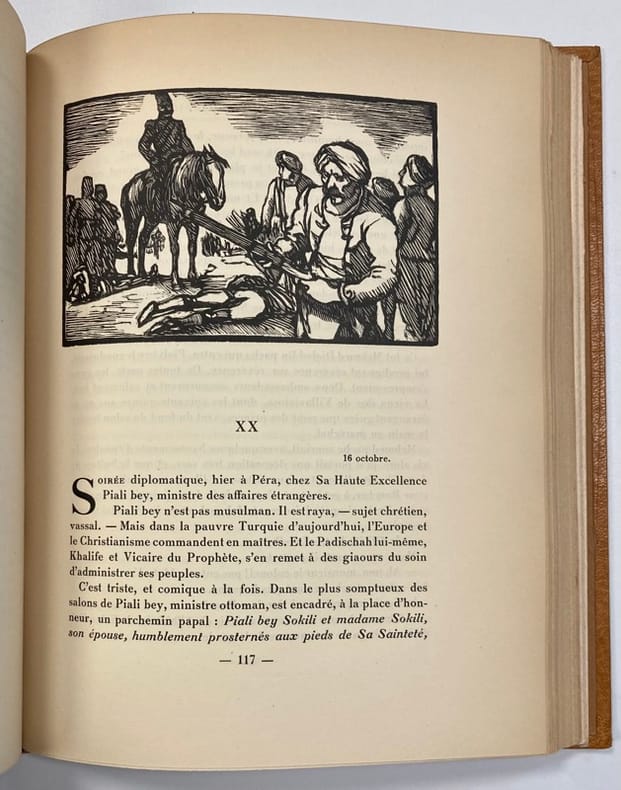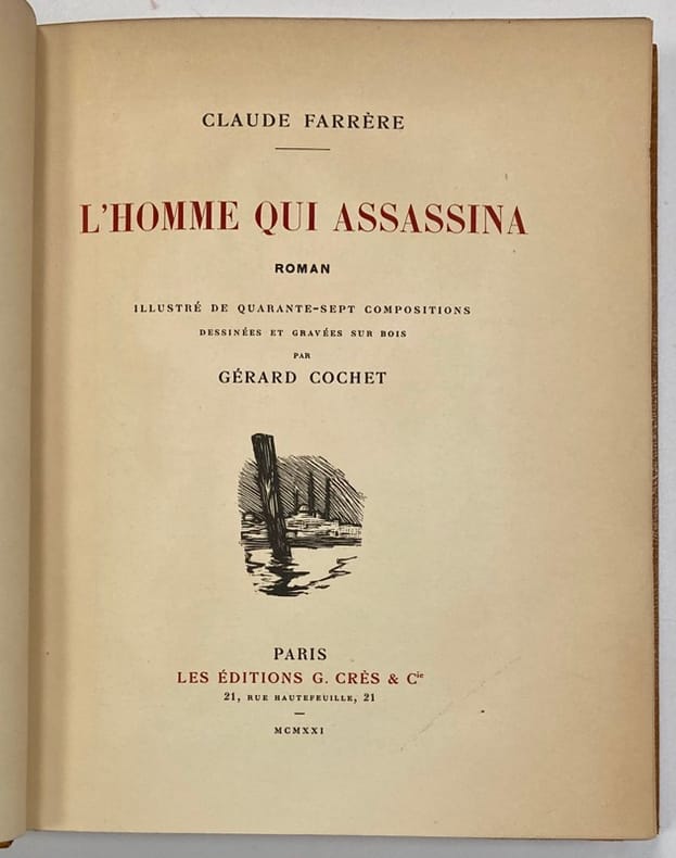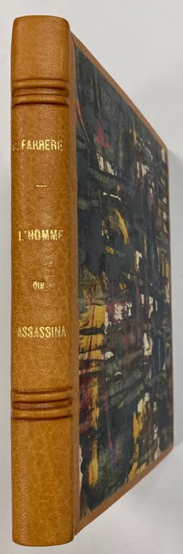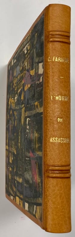 Claude Farrère, Henri Farge (illustrateur), L'Homme qui assassina. Paris, Devambez, 1926. In-4, [4]-190p. Belle édition illustrée de 15 eaux-fortes d'Henri Farge, tirée à 420 exemplaires, un des 300 sur vélin d'Arches filigrané avec le nom de l'éditeur. Ce roman, narré par l'assassin, se passe à Constantinople où Farge ira pour préparer l'illustration du livre. Notons aussi que les éditions Devambez, où expose Farge dès 1920, avaient à partie de 1923 comme directeur artistique Edouard Chimot, avec qui Farge travaille donc étroitement. Demi-parchemin, pièces de titre et tomaison, tête dorée, couvertures et dos conservés. Bel exemplaire.