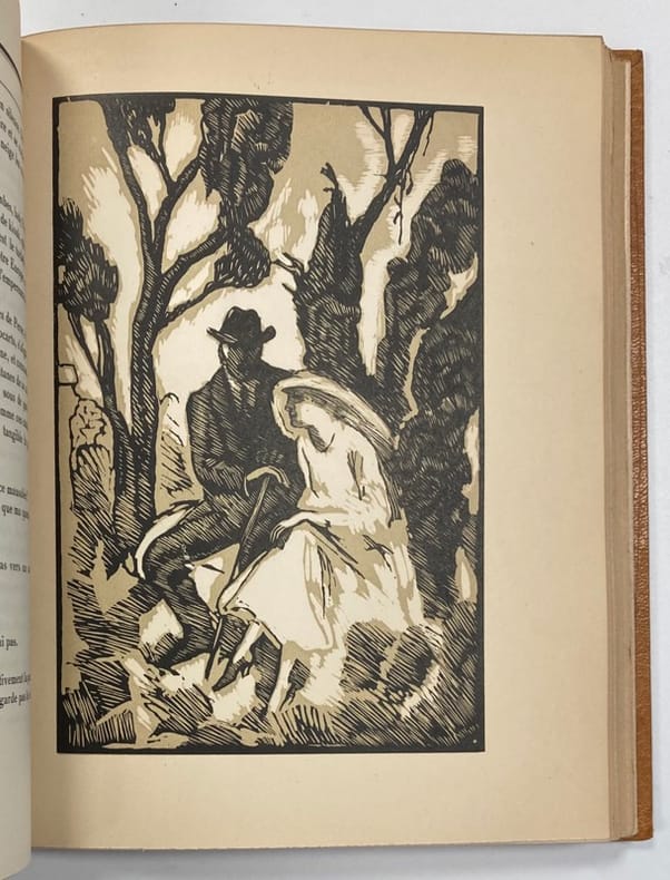 Paris, G. Cres, 1921 19x24.9 cm., 233 pp., edition illustree de quarante-sept compositions dessinees et gravees sur bois par Gerard Cochet, relie demi-maroquin rouge a coins, signee par Laurent Peeters - Anvers. Filet dore cernant les plats de pap., dos orne, dos a 4 nerfs et finnement fleuronnes dores (decor floral), tete doree, couverture imprimee d'editeur. Tirage limite. Tirage de 1105 exemplaires dont 1100 exemplaires sur papier velin pur fil lafuma numerotes de 1 a 1000 et de 1001 a 1100.