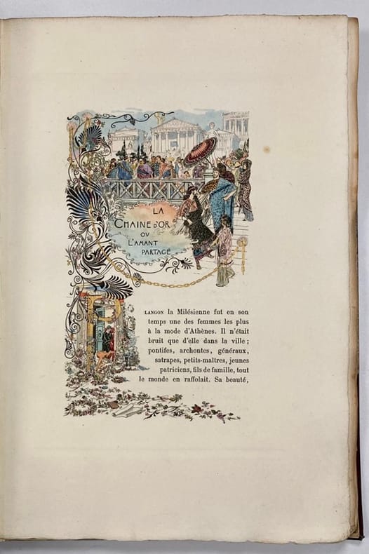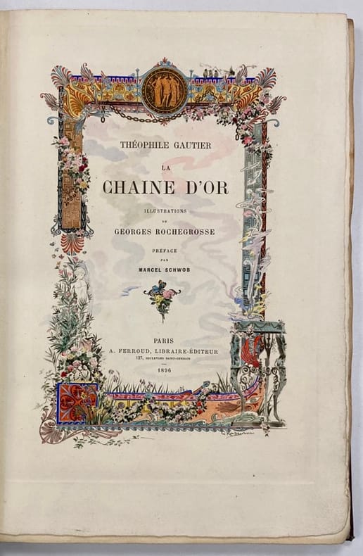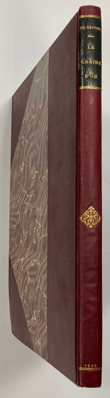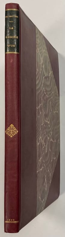 Paris, A. Ferroud. 1896 In-8 (280x200mm) of [2]ff. [58]pp. suite of [15]ff. [2]ff.. Half-moroccan brown with gold fillet between the leather and the paper of the cover. Flat spine with gold title piece framed by a gold chain motif. White endpapers and guards. Cover preserved. Recent binding executed by the Ateliers Boichot. Illustrated cover, title frontispiece, 14 compositions by Georges Rochegrosse in and out of text intaglio hand-colored and sometimes enhanced with gold and a suite in black of all the compositions. The original edition of the Golden Chain appeared twice in the Chronicle of Paris on May 28 and June 1, 1837. Then it was part of the volume A Tear of the Devil in 1849 and finally in 1845 Théophile Gaultier added it to his short stories. Limited edition of 200 copies signed by the artist Very beautiful and very fine execution of the symbolist and orientalist artist George Antoine Rochegrosse. Discover the life of this accomplished artist: https://fr.wikipedia.org/wiki/Georges-Antoine_Rochegrosse His file on the website of the Musée d'Orsay: https://www.musee-orsay.fr/fr/ressources/repertoire-artistes-personnalites/georges-rochegrosse-21006 ------------------------------- In-8 (280x200mm) de [2]ff. [58]pp. suite de [15]ff. [2]ff.. Demi-marocain marron avec filet doré entre le cuir et le papier du plat. Dos plat avec pièce de titre doré encadré par un motif de chaîne en or. Contres plat et gardes blanches. Couverture conservée. Reliure récente exécutée par les Ateliers Boichot. Couverture illustrée, titre frontispice, 14 compositions de Georges Rochegrosse in et hors texte en taille douce colorisées à la main et parfois rehaussées d’or et une suite en noir de toutes les compositions. L’édition originale de la Chaîne d’or parrut pour en deux fois dans la chronique de paris le 28 mai et le 1 juin 1837. Puis elle fit parti en 1849 du volume Une larme du diable et enfin en 1845 Théophile Gaultier la joignit à ses nouvelles. Tirage limité à 200 exemplaires signés par l’artiste Très belle et très fine exécution de l’artiste symboliste et orientaliste George Antoine Rochegrosse. Découvrir la vie de cet artiste accompli : https://fr.wikipedia.org/wiki/Georges-Antoine_Rochegrosse Sa fiche sur le site du musée d’Orsay : https://www.musee-orsay.fr/fr/ressources/repertoire-artistes-personnalites/georges-rochegrosse-21006 État : marques et rousseurs sur la couverture conservée, légère ondulation de la tranche due au papier tout le reste du livre est en très bon état avec sa reliure récente.