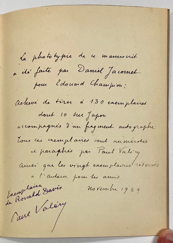 Fac simile par Edouard Champion de ce cahier de notes prises par Valéry en 1910. 1 des 20 exemplaires réservés par l'auteur à ses amis, celui-ci comprenant la mention manuscrite : "Exemplaire de Ronald Davis. Paul Valéry".