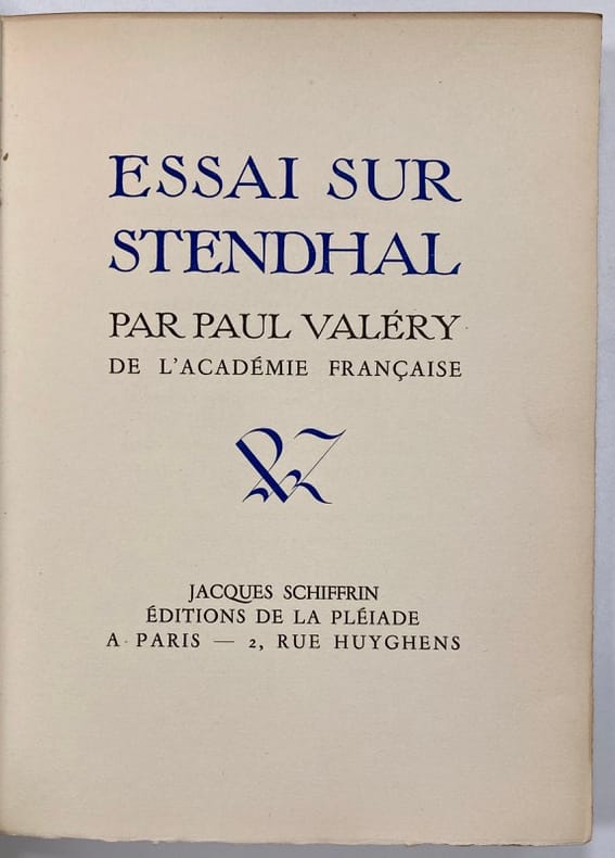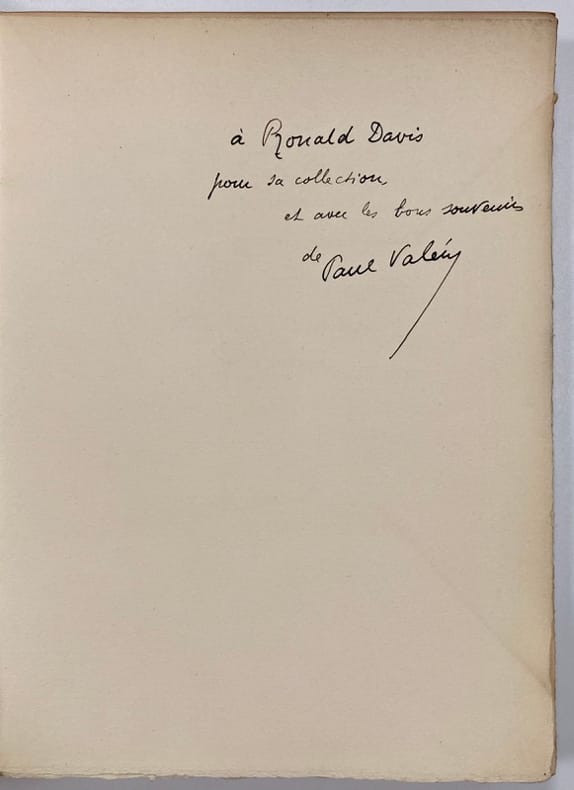 1 des 30 exemplaires hors commerce, "sur Vélin à la cuve, sous couverture spéciale, destinés à trente souscripteurs particuliers à tous les ouvrages de Paul Valéry". Envoi autographe signé : " A Ronald Davis, pour sa collection, et avec les bons souvenirs de Paul Valéry". Edition parue la même année que l'originale.Libraire, éditeur et bibliophile, Ronald Davis collectionna les ouvrages de Paul Valéry.