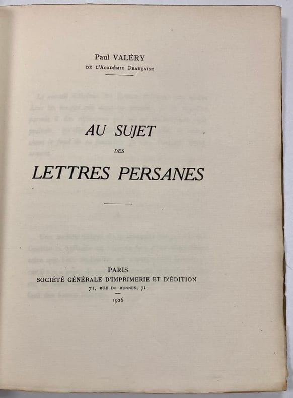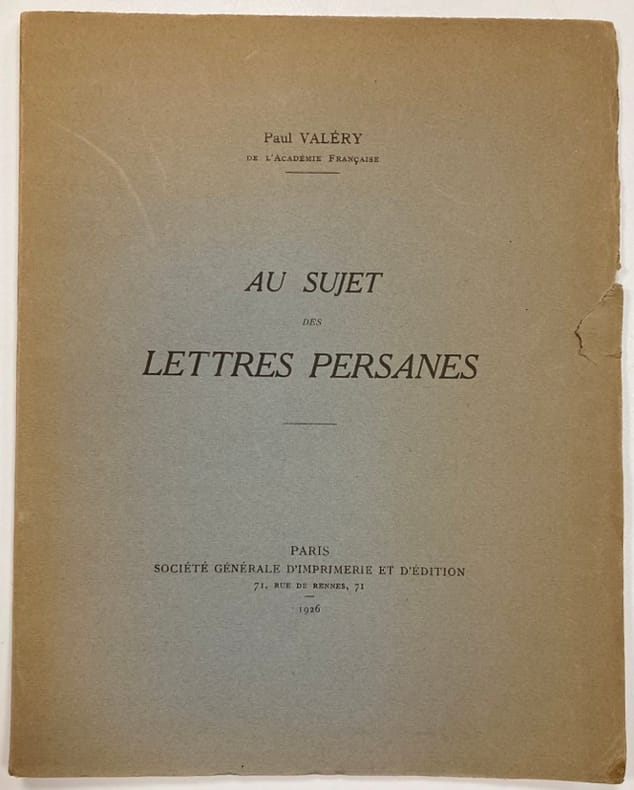Paris. Société générale d'imprimerie et d'édition. 1926. 27 pp. In-8. Broché. En bon état. 1 volume. TIRAGE LIMITÉ. Un des 100 exemplaires numérotés pour l'auteur.Petit livre nous renvoyant à une suite de pensées sur ce fameux classique la littérature française que sont les Lettres persanes. Préparez-vous dès lors que le narrateur dira "je vais divaguer sérieusement", cela présage la littérature vue sous un jour philosophique.