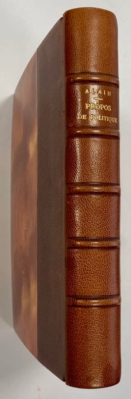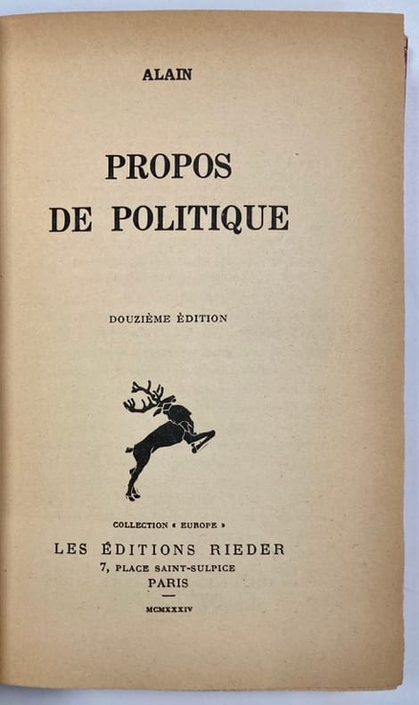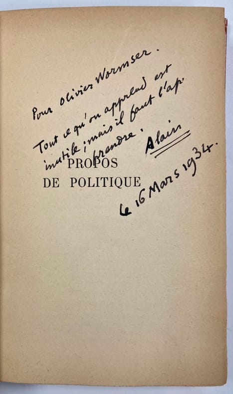 Envoi autographe signé : « Pour Olivier Wormser. Tout ce qu’on apprend est inutile; mais il faut l’apprendre. Alain. Le 16 mars 1934 ». Mention de 12ème mille. Olivier Wormser fut Ambassadeur de France. Il est le Fils d’Olga Wormser, qui tint un salon accueillant artistes et écrivains dans les années 1930, et qui, selon la légende familiale, fut la maitresse d’Alain.
