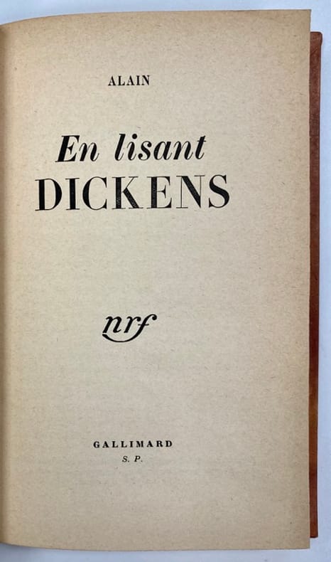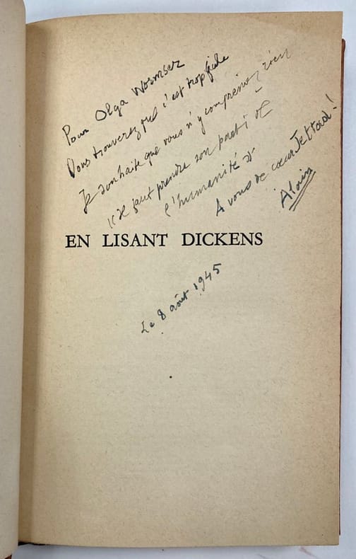 Envoi autographe signé : « Pour Olga Wormser. Vous trouverez que c’est trop facile. Je souhaite que vous n’y compreniez rien. « Il faut prendre son parti de l’humanité ». A vous de coeur… Alain. Le 8 août 1945 ».Olga Wormser, tint un salon accueillant artistes et écrivains dans les années 1930, et selon la légende familiale, fut la maitresse d’Alain.