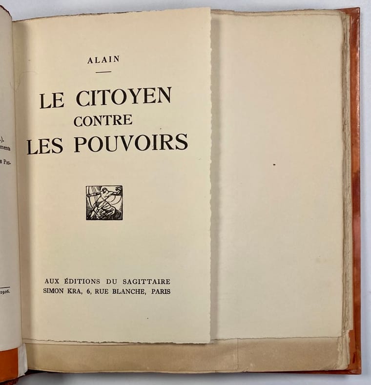 183. edition sagittaire 1926, Simon Kra, 1926, 1926. in-8vo, 235 pages, edition originale. (Exemplaire S.P.). Envoie d'alain et de jean prevost sur la page d'avant garde. ALAIN, de son vrai nom Émile-Auguste Chartier (Mortagne-au-Perche (Orne) le 3 mars 1868 - Le Vésinet (Yvelines) le 2 juin 1951). Il etait philosophe, journaliste, essayiste et professeur de philosophie. Il est rationaliste, individualiste et critique... photos possibles