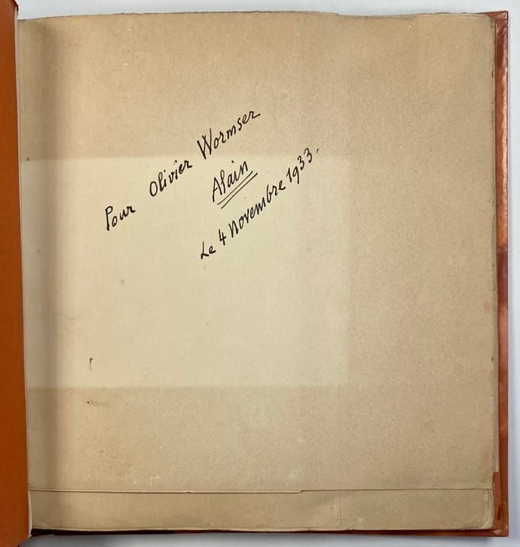 Edition originale. Exemplaire C, à très grandes marges, certaines insolées. Envoi autographe signé : « Pour Olivier Wormser. Alain. Le 4 novembre 1933 ».Olivier Wormser fut Ambassadeur de France et Gouverneur de la Banque de France! Il est le fils d'Olga Wormser, qui tint un salon accueillant artistes et écrivains dans les années 1930, et selon la légende familiale, fut la maitresse d’Alain.