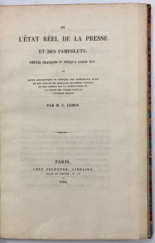 Edition originale. Leber tend à montrer, que contrairement à ce que dit Nodier dans son ouvrage : De la liberté de la Presse avant Louis XIV, la Presse n'est pas aussi libre que prétendu!Leber traite "des principaux actes de nos Rois et de quelques documents curieux et peu connus sur la publication et la vente de livres dans le seizième siècle".