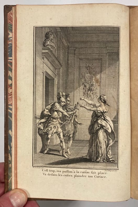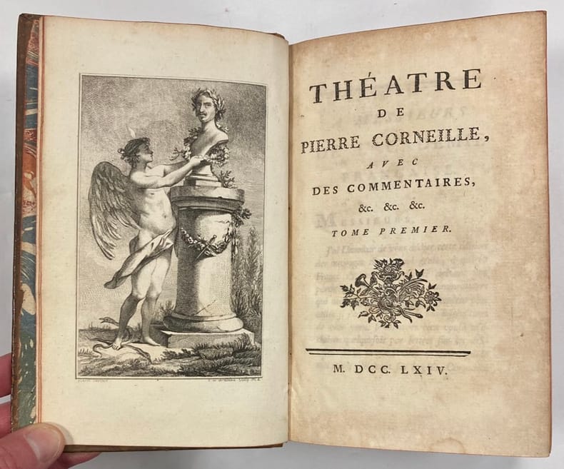 ...1 volume in 8°(12,5x 20 cm), relié veau marbré (avec une sorte de quadrillage décoratif très flou sur les plats).429 pages avec en frontispice, pour deux des trois pièces, une gravure significative de Gravelot (donc, ici, 2). On trouve également, au début de la 1ére et de la dernière pièce une “préface de l’éditeur”. Au début de la 2ème pièce, on trouve une variante: “ Remarque de l’Editeur sur un passage concernant Héraclius”). il s’agit sans doute des Commentaires (de Voltaire) annoncés dans le titre.Le numéro du tome est légèrement estompé mais notre exemplaire est en très bon état.