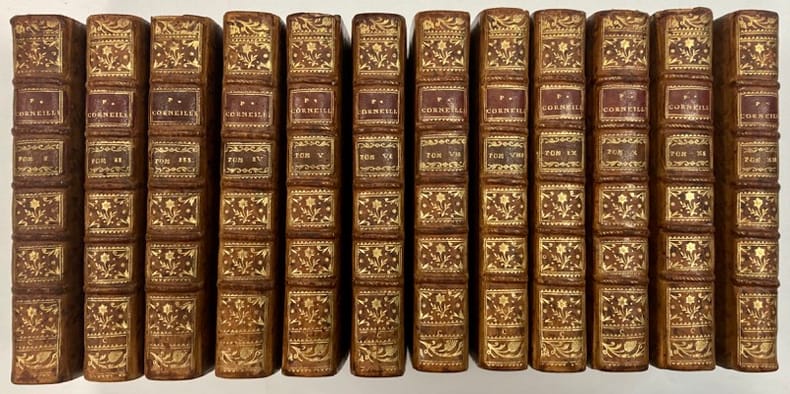 12 volumes in-8 (20 cm x 11,5 cm), maroquin olive (reliure XIXe), dos lisse orné de motifs dorés, pièce de titre et de tomaison fauve, triple filet doré en encadrement des plats avec fleurons dorés en coins, tranches dorées sur marbrure, roulette dorée intérieure, ex-libris de Wallace of Carleton et de Lucien Tissot-Dupont contrecollés sur le contreplat. [8]-454-[1] ; [12]-413-[1]-2 bl.-9-1 bl.-[1] ; [4]-510 ; [4]-482-[1] ; [4]-429-[2] ; [4]-442 ; [4]-463-[1] ; [4]-388 ; [4]-443-[1] ; [4]-495-[1] ; [4]-500 ; [4]-355-[1]-47-1 bl. pages (complet). Légers frottements à la reliure, dos légèrement insolé, quelques feuillets brunis, piqures.Très bon état. Nouvelle édition, commentée par Voltaire, illustrée d’un frontispice ainsi que de 34 gravures hors-texte par Gravelot. Pierre Corneille (1606-1684) nous a livré quinze pièces de théâtre baroques, pleines de vie et d’invention ainsi que quatre tragédies héroïques (Le Cid, Horace, Cinna, Polyeucte). Mais c’est dans une dizaine de pièces tardives que son génie se déploie : Théodore, Rodogune, Héraclius, Othon... On y découvre le fond de l’expérience humaine : le tragique, et parfois le comique, se révèlent moins dans le coût du devoir ou de l’erreur que dans l’impossibilité de savoir quoi faire. Bel exemplaire.