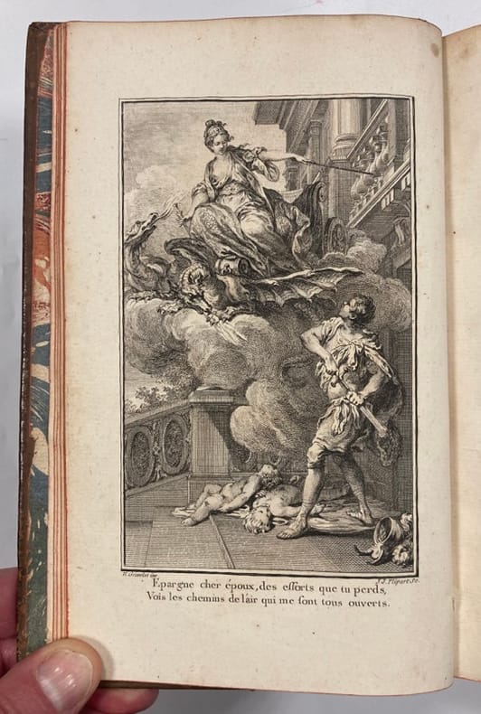 ...1 volume in 8°(12,5x 20 cm), relié veau marbré (avec une sorte de quadrillage décoratif très flou sur les plats).495 pages avec en frontispice, pour chacune des quatre pièces, une gravure significative de Gravelot (donc, ici, 4). On trouve également, au début des 3 premières pièces une “préface de l’éditeur”. il s’agit sans doute du Commentaire (de Voltaire) annoncé dans le titre.Le numéro du tome est légèrement estompé mais notre exemplaire est en très bon état.