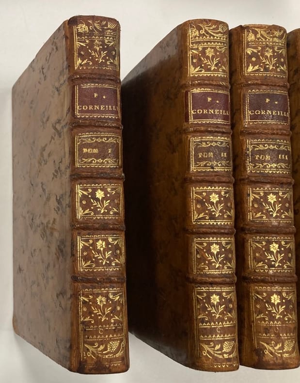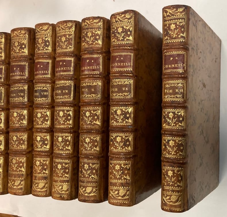 Mélite, comédie 1625 - Clitandre, Tragédie 1630 - La veuve ou le traître trahi, Comédie 1634 - La galerie du palais ou l'amie rivale, comédie 1634 Attila, roi des Huns, 1667 tragédie - Tite et Bérénice, comédie heroique 1670 - Pulchérie, tragédie 1672 - Suréna, Général des Parthes, tragédie 1674 - Psyché, tragi-comédie et ballet On trouve au début de chaque pièce une "préface de l'éditeur" ainsi que des " commentaires aux lecteurs" en fin de chaque pièce, de la plume de Voltaire. vols reliés pleine basane époque, sans page de titre, complet du portrait de Corneille, gd in8, 200x130, accrocs, manque et fendillements, ( mérite une restauration ), bien solide, bon état intérieur, frais, 476, 447pp. Edition Renouard, circa 1817 ref/19