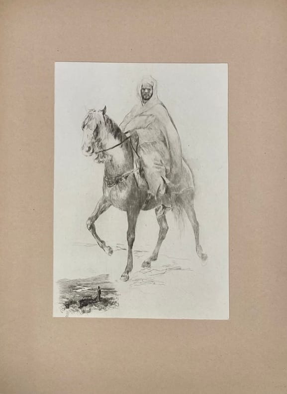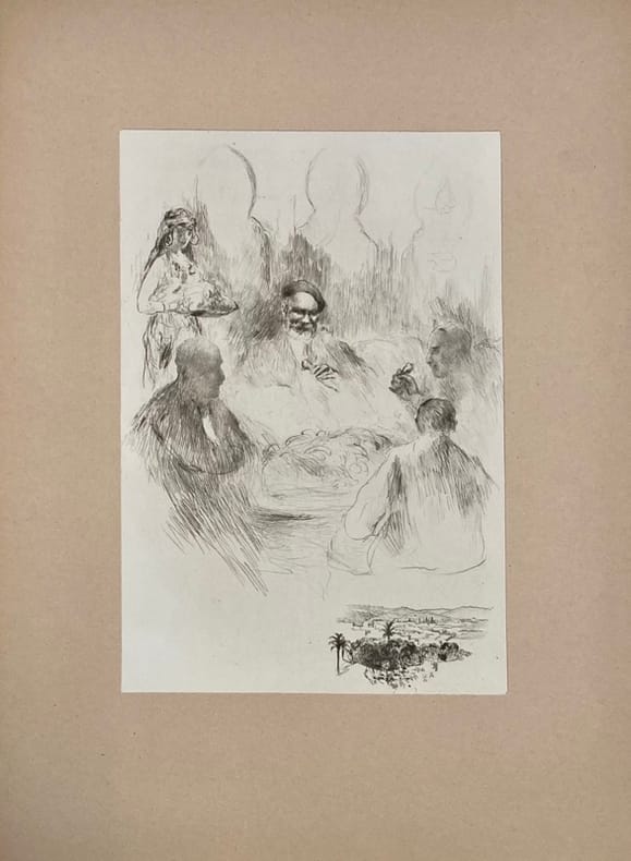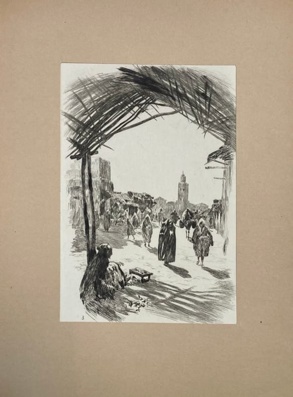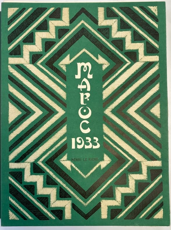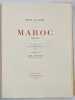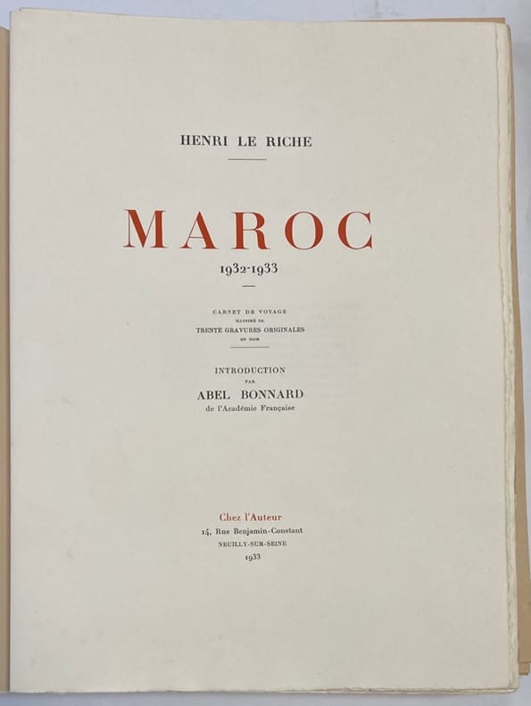 Illustré de 30 gravures originales à pleine page d'Henri LE RICHE, numérotées, sous passe-partout. Exemplaire numéroté sur vélin d’Arches. 1 des 24 exemplaires réservés à l’artiste et à ses amis, comprenant 7 planches supplémentaires (dont 1 variante de la planche n°13). Les 37 gravures, en noir, sont accompagnées de remarques, et représentent : des scènes de rue, portraits, ou encore paysages croqués au détour de son périple à travers les villes impériales ou le désert… suite au voyage effectué au Maroc en 1932-1933 par Henri Le Riche. Envoi autographe signé de l’auteur au crayon à l’industriel grenoblois: « A monsieur Jean Bouchayer, en souvenir des temps lointains au lycée de Grenoble, Paris, Août 1934. »Introduction d’Abel Bonnard.Discrètes rousseurs sur le dernier feuillet de la préface.