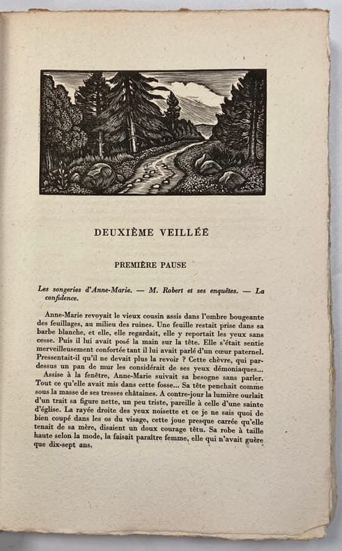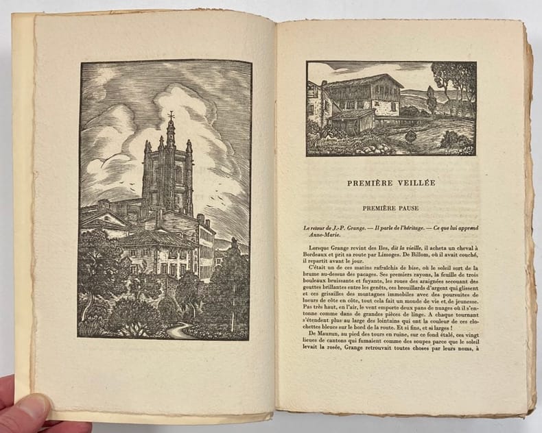 Deux volumes forts in-8°, brochés avec couverture semi-rigide éditeur rempliée, avec les deux premiers plats illustrés d’une gravure en noir de François Angéli. Impression sur papier d’Auvergne fabriqué à la main par le Maître papetier Auguste Favier à Lacat, dont 1000 exemplaires numérotés (celui-ci est le N° 890); les pages ne sont pas massicotées , comme pour souligner la nature artisanale de ce papier... Il s’agit de contes à dire ou à lire sur plusieurs veillées au coin du feu... -Tome 1 : 361 pages + Table des matières . Tome second: 385 pages + Table des matières. On trouvera dans le tome 1 le CHÂTEAU DES SEPT PORTES (ou “Les Enfances de Gaspard”) avec sept veillées, puis L’AUBERGE DE LA BELLE FERMIÈRE (ou “Quand Gaspard de Guerre revint”) , avec sept veillées. -Tome 2: LE PAVILLON DES AMOURETTES (ou “Gaspard et les bourgeois d’Ambert”, avec 7 veillées. Puis LA TOUR DU LEVANT (ou “Quand Gaspard mit fin à l’Histoire”), avec 7 veillées. Avec un très bel ENVOI de Henri POURRAT sur la page faux-titre du tome 1, TRES BON ETAT. [52009]