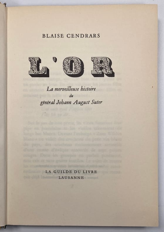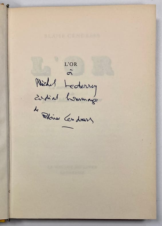 Edition numérotée, hors commerce, réservée aux membres de la Guilde du livre. Envoi autographe signé sur le faux-titre : L'or "à Michel Lederrey. Cordial hommage de Blaise Cendrars".