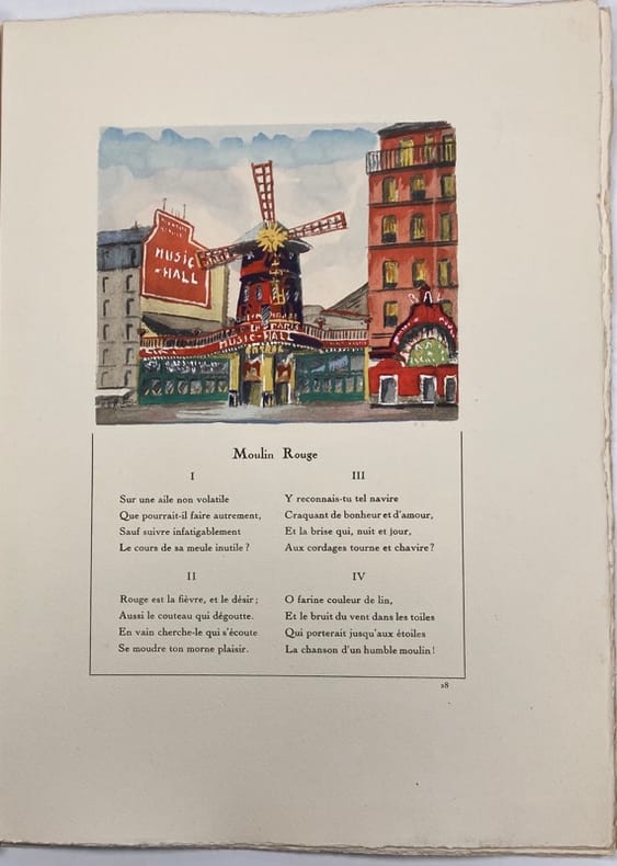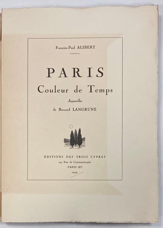 Paris, Editions des Trois Cyprès, 1929. In-4, en feuilles, sous couv. ill. rempliée et emboitage, 36 pp., poésies de François-Paul Alibert, aquarelles in-texte de Bernard Langrune dont un portrait de l’auteur à pleine page. Tirage limité à 325 exemplaires numérotés, un des 300 sur vélin d’Arches à la forme, n°236.