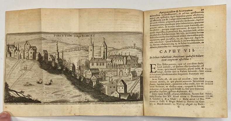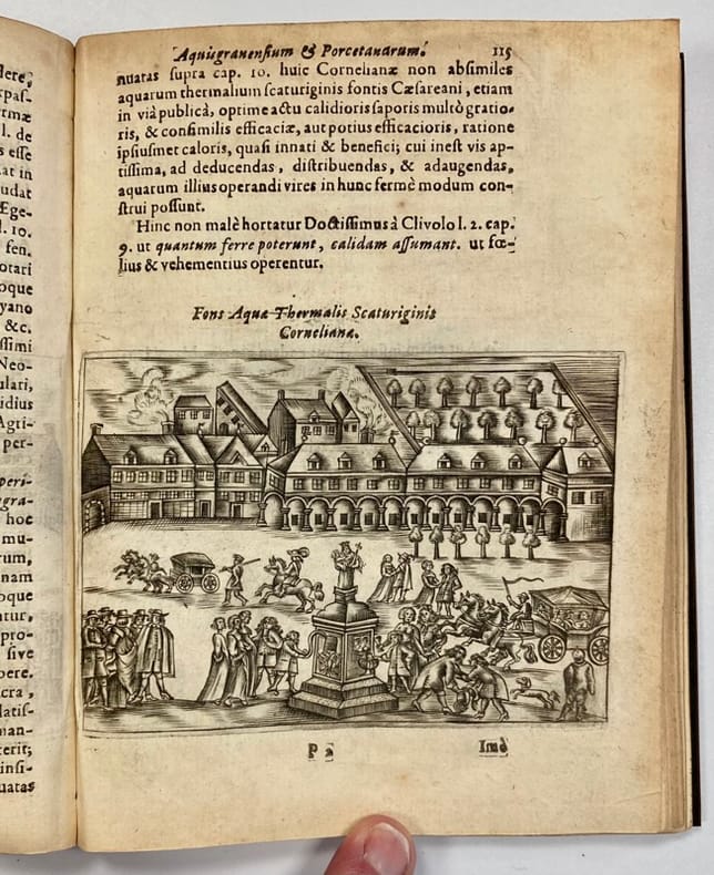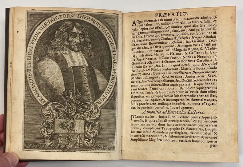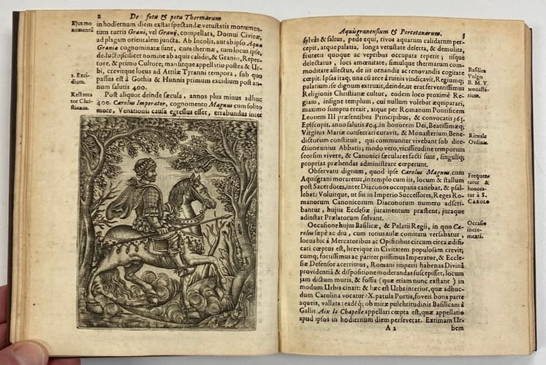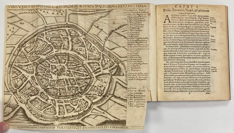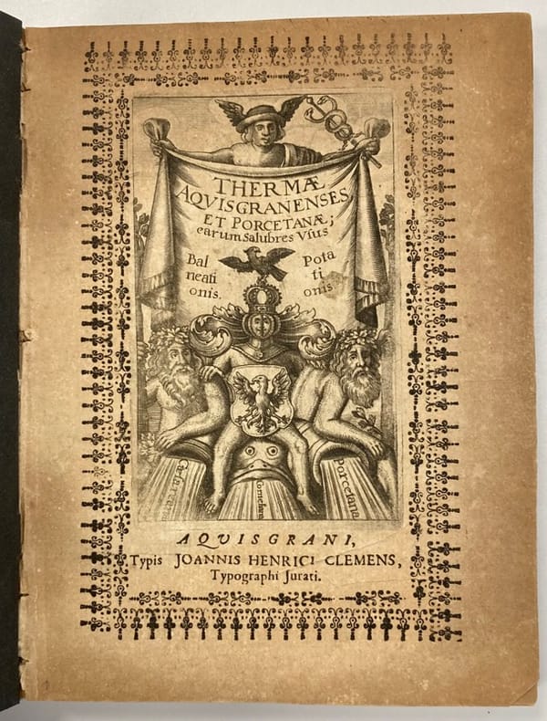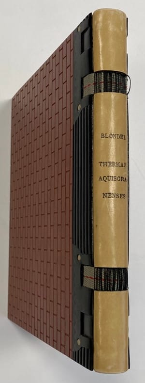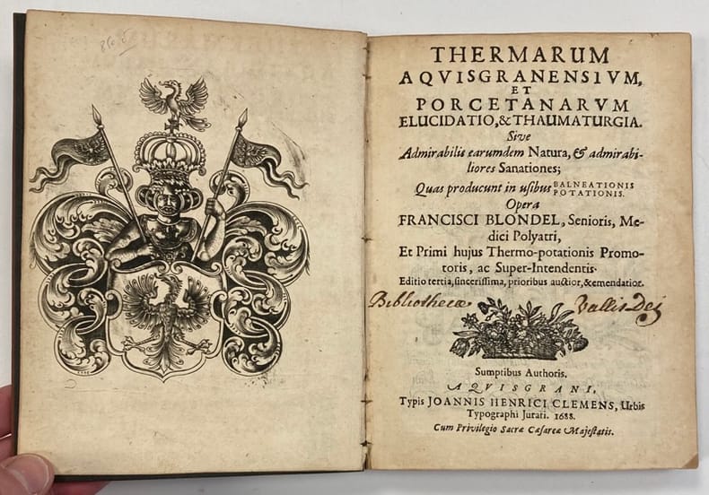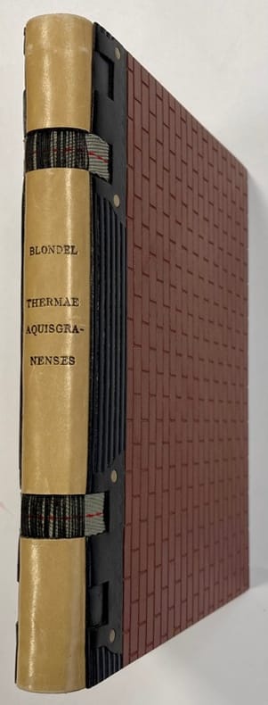 Troisième édition de ce traité sur les eaux minérales et thermales d'Aix-la-Chapelle et de Borset.L'illustration, gravée sur cuivre, comprend un titre-frontispice avec les grandes armes d'Aix-la-Chapelle au verso, 4 blasons au verso du titre, un portrait de l'auteur, 2 belles planches dépliantes représentant des vues d'Aix-la-Chapelle et de Borset, et 16 figures dans le texte, dont l'une d’elle est un portrait équestre de Charlemagne en tenue de chasse (p. 2). Deux vignettes ne sont pas imprimées directement sur la feuille mais collées aux emplacements prévus à cet effet (pp. 50 et 116). Intéressante reliure de Jean de Gonet sur un livre ancien. Elle porte l'étiquette du relieur avec sa justification (n°75/200). Ex-libris manuscrit du XVIIIe siècle sur le titre : Bibliothecae Vallis Dei, sans doute l'abbaye cistercienne de Val-Dieu près de Liège en Belgique. Ex-libris CL. Titre-frontispice et verso du feuillet d'errata roussis au contact des gardes.