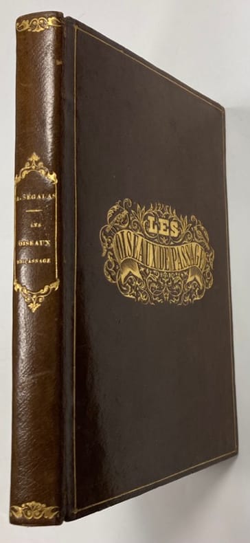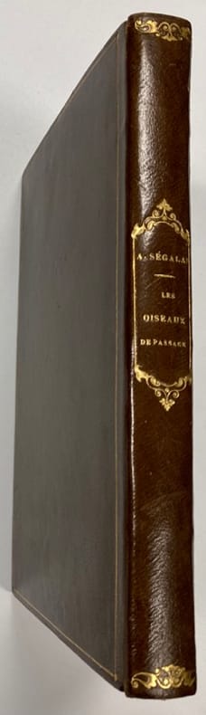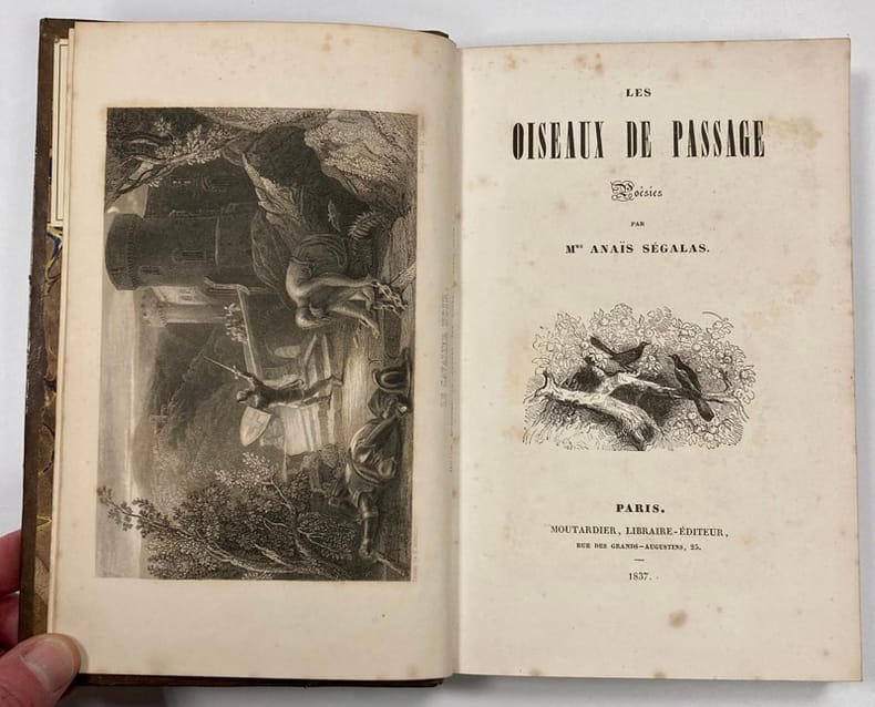 Recueil de poèmes d'Anaïs Ségalas (1811-1895), dramaturge, poétesse et romancière célèbre à son époque, engagée notamment pour les droits civiques et l'égalité entre hommes et femmes. Les Oiseaux de passage réunissent notamment des pièces d'abord publiées dans les journaux. Illustré d'un frontispice, de 4 figures hors texte et de 20 vignettes. L’exemplaire a été prêté pour une exposition de la ville de Bordeaux en 1938 (étiquette). Rousseurs. Petits frottements à la reliure. Vicaire VII, 464.