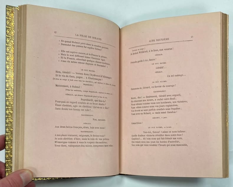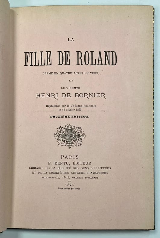 Édition originale, avec mention fictive de douzième édition. Un des très rares exemplaires sur papier de couleur, ici sur papier rose.Originaire de Lunel dans l'Hérault, Henri de Bornier fut conservateur de l'Arsenal. La Fille de Roland, créée pour Sarah Bernhard, apporta la célébrité à l'auteur en quelques jours et il entra plus tard à l'Académie française contre Zola. C'est la seule œuvre à succès de Bornier, qui resta 3 mois à l'affiche de la Comédie Française. Petits frottements aux charnières, dos et bords des plats légèrement passés. Talvart et Place II, 124