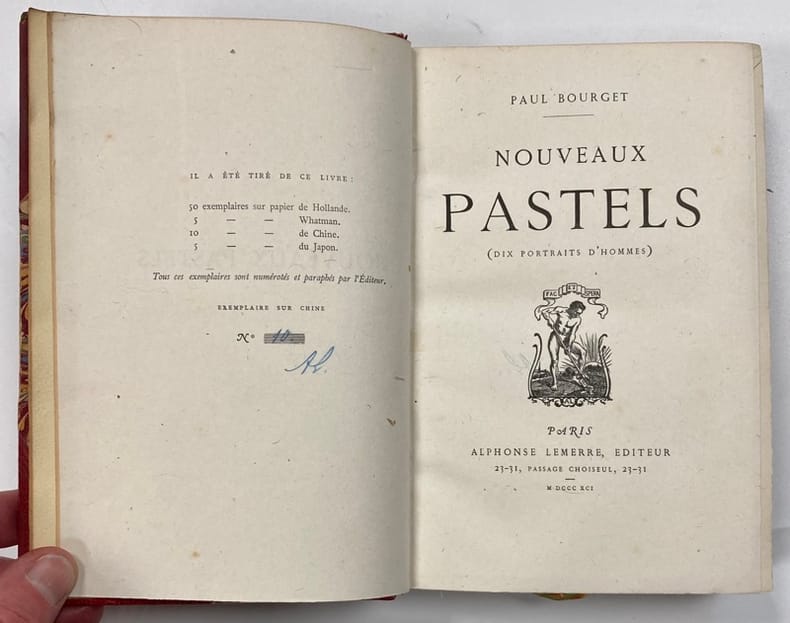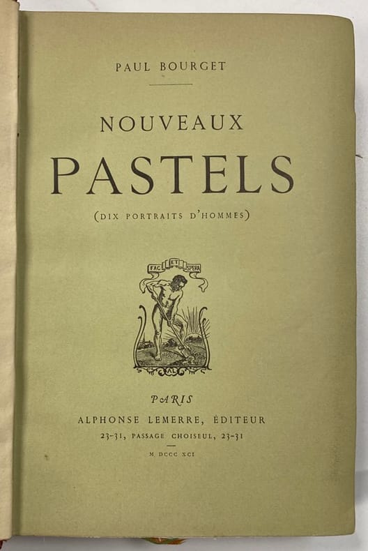 Paul Bourget. Nouveaux pastels. (Dix portraits d.hommes). In French /Paul Bourget. Nouveaux pastels. (Dix portraits dhommes). In French. Paris Alphonse Lemerre, editor 1891. 497 p. We have thousands of titles and often several copies of each title may be available. Please feel free to contact us for a detailed description of the copies available. SKUalb651b657db1842022.