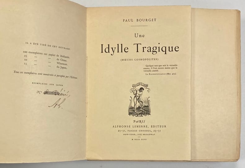 Édition originale.1 des 15 exemplaires sur Japon. Il porte le paraphe de l'éditeur et la justification suivante : n° de Désiré. Fils d’Alphonse Lemerre, Désiré Lemerre prendra ensuite les rênes de la maison et sera l'exécuteur testamentaire de Sully-Prudhomme. Bel exemplaire sur papier Japon à très grandes marges. Petits défauts et manques à la couverture, premier plat désolidarisé. Cet ouvrage mériterait une belle reliure!