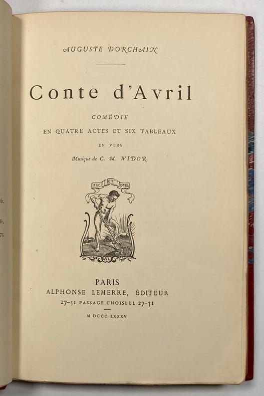 Édition originale. La comédie fut créée à l'Odéon le 22 septembre 1885, avec une musique de Widor. Envoi autographe de l'auteur « A Madame E. Doche, hommage respectueux et sympathique de l'auteur. Auguste Dorchain ». Née Eugénie de Plunkett en 1823, la comédienne Eugénie Doche fut très jeune remarquée pour son extraordinaire beauté blonde. Elle acquit une popularité inouïe après avoir créé le rôle de Marguerite Gautier dans la Dame aux Camélias qu'elle joua 617 fois entre 1852 et 1867. Alexandre Dumas avait dit d'elle : « une pareille artiste n'est plus une interprète, c'est un collaborateur ». Parmi ses multiples liaisons, on peut citer l'homme de lettres Sheridan, le journaliste Aurélien Scholl, la comédienne Milita, mais surtout François Coppée, l'ami de cœur et l'âme soeur, demeuré très proche d'Eugénie toute sa vie. Bel exemplaire. Talvart et Place II, 276.