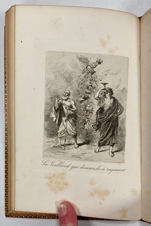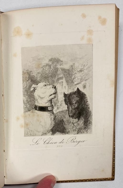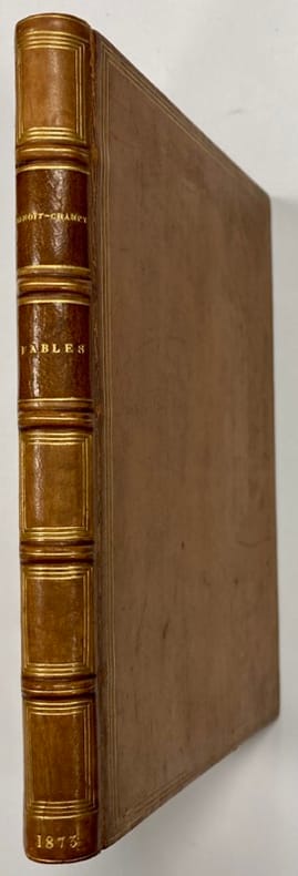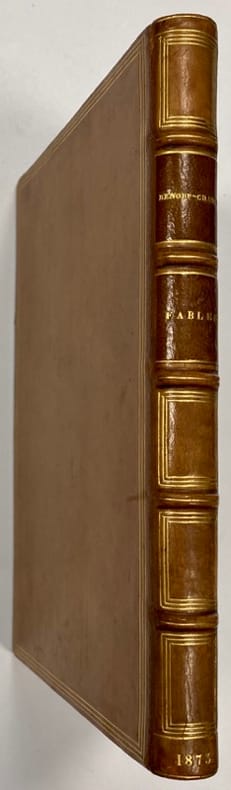 « Premier état de l’édition originale des Fables de La Fontaine, l’un des livres les plus célèbres d’Occident, donnée par La Fontaine lui‑même, contenant les six premiers livres. Elle est rare et fort recherchée. » (A. Claudin, Bibliographie des Éditions Originales, n° 164). Tchemerzine, III, pp. 865-866 ; Brunet, III, p. 750 ; En Français dans le texte, n°105. « Edition originale des six premiers livres des Fables » (Tchemerzine, III, 866). L’exemplaire de M. A. Rochebilière (vendu en 1882) possédait un carton du feuillet oii, verso, de la vie d’Esope. Le feuillet original porte à la 6è ligne « donner le lustre » et à la 18è « amplete », cas du présent exemplaire. Cette édition originale est riche de 124 Fables parmi lesquelles « Le Chêne et le roseau », « Le Corbeau et le Renard », « La Grenouille qui veut se faire aussi grosse que le bœuf », « Le Laboureur et ses enfants », « Le Lièvre et la Tortue », « Le Loup et l’Agneau », « Le Lion et le Rat », « Le Meunier, son fils et l’Ane », « La Mort et le bûcheron », « Les Deux Mulets », « L’œil du Maître », « Le Pot de terre et le pot de fer », « Le Renard et la cigogne », « Le Renard et les raisins »... Elle avait été composée pour le Dauphin, fils de Louis XIV (dont les armes ornent la page de titre). Le fabuliste s’y montre fidèle à l’esprit de ses modèles, Ésope et Phèdre, qu’il se contente d’égayer par des traits nouveaux ou familiers, mais Les Fables de 1668 marquent une date capitale dans l’histoire du genre, ..., dès l’Antiquité, l’apologue était passé de la prose grecque... aux vers latins, ..., il appartient à La Fontaine de l’avoir annexé véritablement à la poésie... (En français dans le texte, n° 105). L’édition est illustrée de 118 eaux-fortes, signées François Chauveau, et de bandeaux, lettrines et culs-de-lampe gravés sur bois. Les gravures sont placées en tête des fables, encadrées d’un double filet et signées F. C. (François Chauveau) ; l’édition contient en outre quelques frises et quelques culs de lampe. La publication de la seconde série des Contes de La Fontaine en 1666, avait causé un grand scandale et Louis XIV qui n’aimait pas l’ami de Fouquet lui avait fait faire des observations par Colbert. La Fontaine comprit la nécessité de s’assagir et, le 31 mars 1668, fit paraître la première édition des Fables. L’œuvre eut un succès foudroyant et La Fontaine fut, dès ce moment, considéré comme l’Ésope français. « Cette belle édition originale, imprimée avec soin, est illustrée de petites gravures à mi-pages, signées F. C. (François Chauveau). Les fins de page sont ornées de culs-de-lampe typographiques dont quelques-uns sont d’un beau style. Les armoiries qu’on voit sur le titre sont celles du Grand Dauphin auquel le recueil est dédié. On y trouve les six premiers livres comprenant 124 fables qui paraissent ici pour la première fois, puis l’Épilogue ». (J. Le Petit, Bibliographie des principales Editions originales, p. 234.) La rareté des exemplaires de tout premier état conservés dans leur reliure de l’époque est légendaire. Jules Le Petit, dans sa bibliographie, ne mentionne que des exemplaires reliés au XIXe siècle : « Prix : Vente Solar (1860), bel ex. mar. r. par Trautz-Bauzonnet. 575 fr. – Vente du baron J. Pichon (1869), mar. r. par Trautz, I,360 fr. - Répertoire Morgand et Fatout (1878), ex. grand de marges (0,244 miliim.), mar r. par Trautz, 3400 fr. - Vente de Béhague (1880), mar. r. par Trautz, ex. de la vente Pichon, 2 700 fr. - Vente Guy-Pellion (1882), mar. r. doublé de mar. bl. par Trautz 3, 600 fr. - Vente J. Renard (1881), mar r. par Capé, I,400 Fr - Vente du Comte Roger du Nord (1884), très bel ex. (hauteur 0,247 millim.), mar. citron, par Trautz, I,700 fr ». Brunet (supplément VII, 747) ne mentionne aucun exemplaire en reliure ancienne. Tous sont reliés au XIXe siècle : « en mar. de Trautz, 855 fr. Double ; cet exempl. qui n'était pas des plus beaux, avait été payé 380 fr. ; en mar. de Duru, 495 fr. Chedeau ; en mar. de Trautz, fort beau, 1,360 fr. baron Pichon, revendu 2 050 fr. Benzon ; enfin, en mar. doublé de Trautz, un exempl. de toute beauté, est porté à 2, 800 fr. au catal. Morgand et Fatout ». Quant à Tchemerzine, il ne cite qu’un seul exemplaire relié en veau ancien, celui de Daulnoy vendu au prix considérable de 24 000 Fr. de l’époque. Les rares exemplaires connus en maroquin sont en reliure du XVIIIe, c'est-à-dire postérieurs d’au moins deux générations : celui de la comtesse de Verrue (aujourd'hui perdu) qui commença sa collection à son retour en France en 1700 (1670-1736 ; maroquin rouge, ancienne collection Alexandrine de Rothschild, Répertoire des biens spoliés, section « Livres », p. 400, n° 7715) et celui du comte de Toulouse également en maroquin rouge (1678-1737 ; localisation inconnue). Les deux exemplaires en veau à provenance attestées sont également reliés au XVIIIe siècle : celui du comte d'Hoym qui constitua sa collection entre 1717 et 1735 et mourut en 1737 (veau fauve, vente Hayoit, Sotheby's Paris, 28 juin 2001, n° 47, acquis par le commerce ; dos remonté et très restauré) et le second exemplaire de la comtesse de Verrue pour sa résidence de Meudon (Bibliothèque nationale ; reliure en veau très restaurée), catalogue de la vente Pierre Berès. Citons quelques-uns des exemplaires répertoriés en véritable reliure de l’époque : - en veau brun aux armes du Chancelier Séguier (cf. Brunet ; localisation et état inconnus). - en veau brun, bibliothèque privée. - l’exemplaire Rochebilière de second état mesurait 225 mm de hauteur (n°164). - en 2007, un exemplaire de second état en vélin ancien, mesurant 232 mm de hauteur, avec seulement deux corrections manuscrites de l’époque aux pages 57 et 176, était vendu 195 000 €. - en 2010