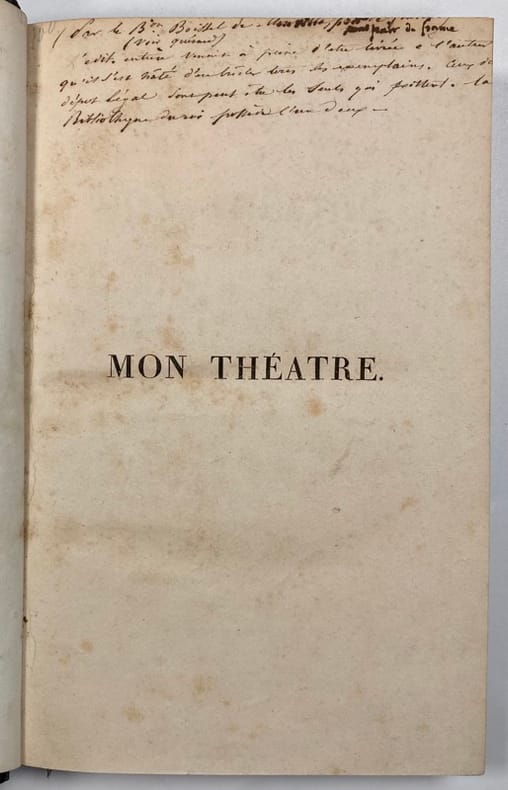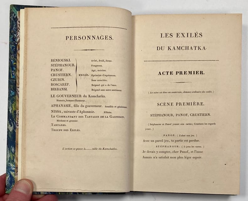 Édition originale de ce recueil de 4 textes : Les Exilés du Kamchatka, Abradate et Panthée, Une femme en est deux, et le projet d'un nouveau drame. Une préface très spirituelle donne les idées de l'auteur sur le théâtre et l'art d'écrire. Boissel de Montville (1763-1832) fut d'abord conseiller au Parlement avant d'entrer à la chambre des Pairs. Selon Barbier III, 332., « l'édition entière a été mise au feu par l'auteur. Il n'en reste que les exemplaires de dépôt ». C'est aussi ce qu'indique une note manuscrite ancienne sur le faux-titre : « L'édition entière venait à peine d'être livrée à l'auteur qu'il s'est hâté d'en brûler tous les exemplaires. Ceux du dépôt légal sont peut-être les seuls qui existent. La bibliothèque du Roi possède l'un d'eux ». Infimes rousseurs. Bel exemplaire, qui semble donc avoir survécu à la rage destructrice de son propre auteur.