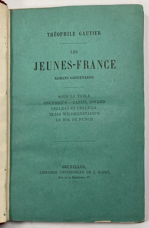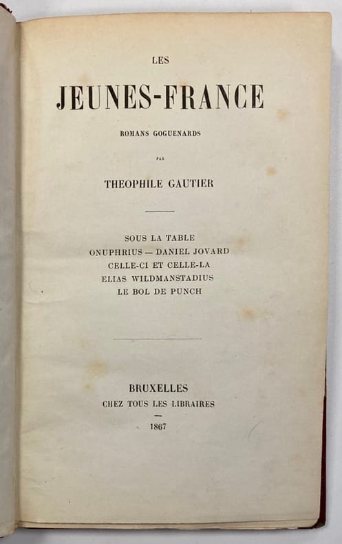 Charpentier, 1875. Les jeunes-France. Romans goguenards, suivis de Contes humoristiques; In-16° rel. edit. 372 p. Cachets d'ex-libris. Rel. défraîchie. Bon état inter.