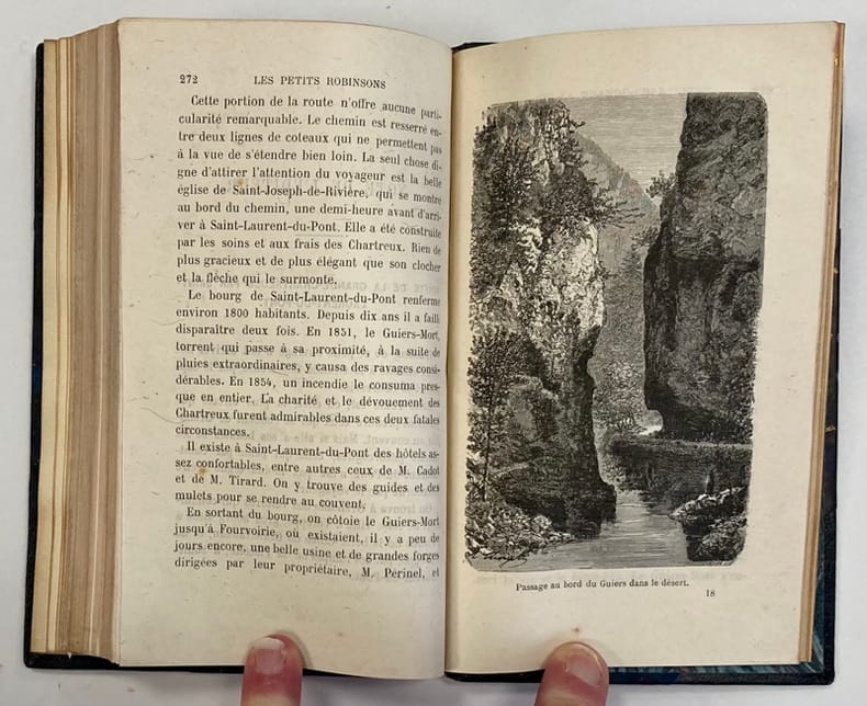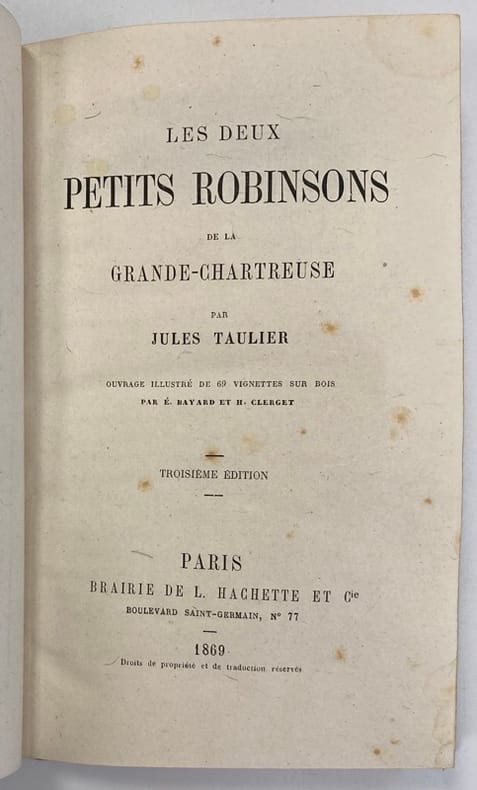 3ème édition de ce récit d’aventure, ornée de 69 gravures par Bayard et Clerget, dont 27 hors-texte.Un des rares exemplaires sur papier de Chine, L’itinéraire suivi par deux orphelins à travers le massif de la grande Chartreuse reste avant tout un prétexte pour faire découvrir au lecteur tous les attraits de la région: « Nous terminons en conjurant le voyageur de faire la route à pied ou à dos de mulet, et d’éviter avec soin la voiture qui, empêchant de voir, enlèvent ainsi à ce désert tout son charme et toute sa poésie ».Infimes rousseurs.