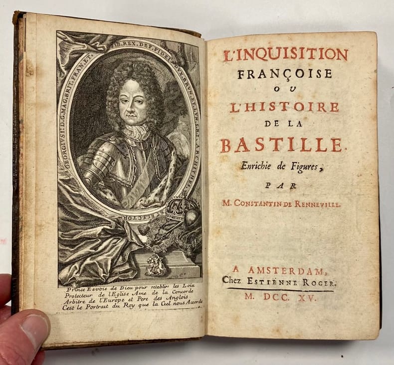 René-Auguste Constantin de Renneville, né à Caen, vers 1650, après avoir fait d'assez bonnes études, il s'engagea dans le corps des mousquetaires et en sortit au bout de quelques années pour remplir la place de directeur des aides et domaines de Carentan que Chamillart lui avait fait donner en récompense de ses services. Il partit en 1699 en hollande, après s'être converti au protestantisme, Mais n'y trouvant pas les avantages qu'il y espérait il retourna en France, ou il se fit emprisonné pendant 11 ans à la Bastille pour espionnage pour le compte de la Hollande. C'est la Reine d'Angleterre Anne qui lui permit de sortir et il passa en Angleterre où il obtint une pension du roi George I et à qui il dédia son histoire de la bastille où il dévoila quelques uns des mystères de cette prison. Le livre eu un grand retentissement et fut traduit dans les principales langues européennes. Haag, la France Protestante... vol 8 col.416. Index librorum prohibitorum, XI, 1600-1966, Brunet, IV, col. 1233.