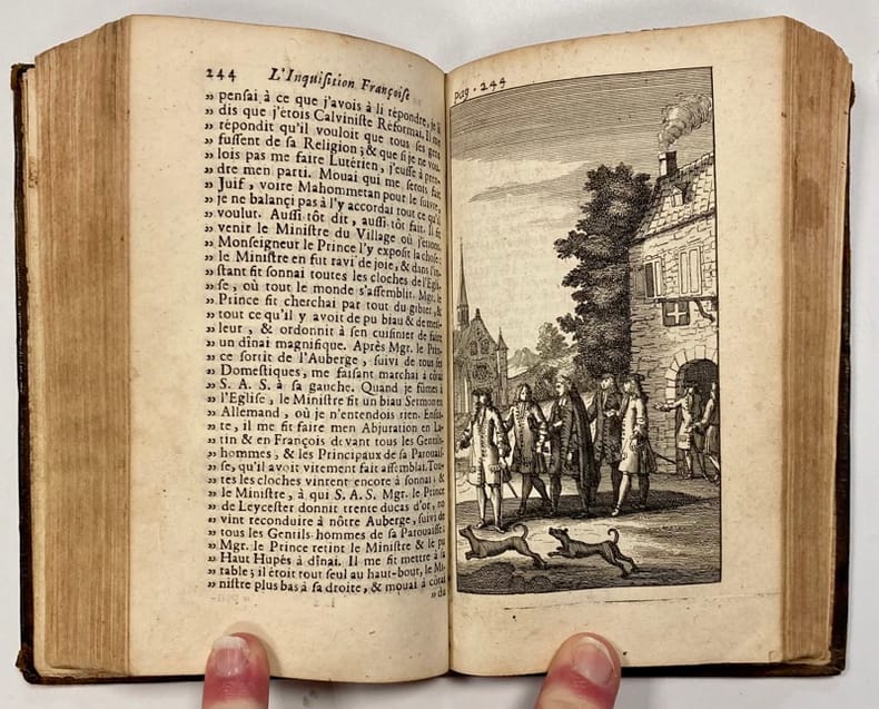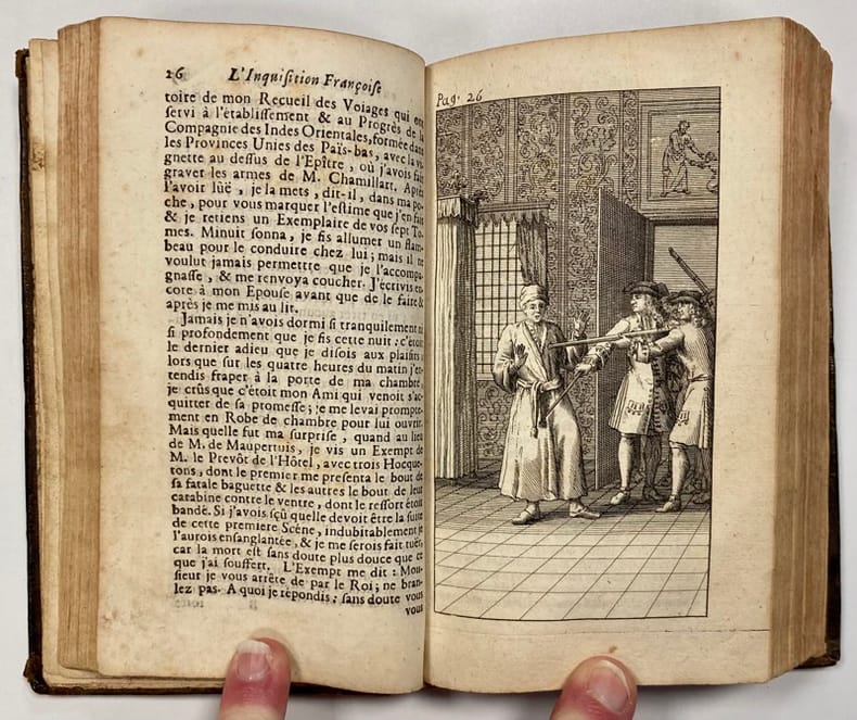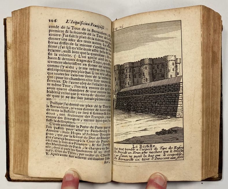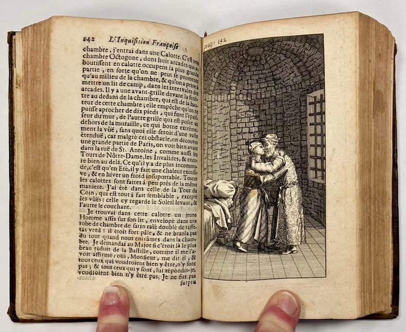 Edition originale. Forme le cinquième volume de la série intitulée L'Inquisition françoise ou l'Histoire de la Bastille, parue originellement en 1715 en seulement deux volumes, et qui contient, aux p. 241-438, des extraits de la "Relation de l'Inquisition de Goa", par Charles Dellon. L'iconographie de notre volume est d'ailleurs entièrement reprises des célèbres planches qui illustrent ce témoignage qui connut une immense vogue au XVIIIe siècle.René-Constantin de Reneville (1650-1723) fut embastillé de 1702 à 1713. Agent secret de Louis XIV aux Pays-Bas, il fut suspecté de jouer un double jeu.Il donne dans cet ouvrage un des rares témoignages sur la prison au début du XVIIIe siècle. Mais le récit est le plus souvent une suite d'anecdotes étonnantes et inattendues ; les gravures qui accompagnent ne le sont pas moins d'ailleurs, montrant souvent des scènes anecdotiques.Van der Vékéné, 396 (ne connaît que l'édition de 1724). - - VENTE PAR CORRESPONDANCE UNIQUEMENT - LIEN DE PAIEMENT, NOUS CONSULTER.