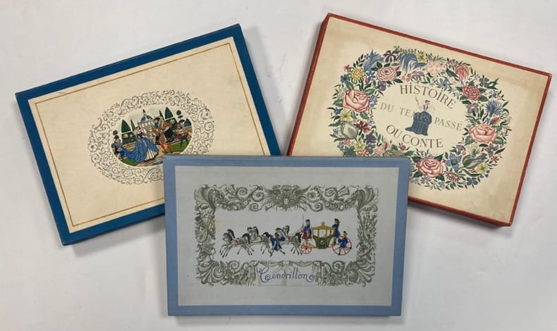 Edition illustrée par Henry Lemarié de 109 compositions in-texte en couleurs dont 3 pages de titre, et de 3 compositions supplémentaires reproduites sur les emboitages.Exemplaires numérotés sur Vélin de Rives. Prospectus en noir de « La Belle au Bois Dormant » en fin d’ouvrage.Charmante collection illustrée qui devait initialement comprendre six contes mais dont trois seulement furent édités.Emboitage de « La Belle au Bois Dormant » légèrement abimé.