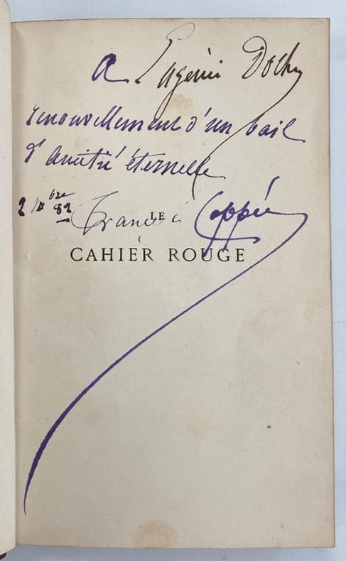 Edition originale de ce recueil de poèmes enrichi d’un envoi autographe signé de l’auteur , à l'encre bleue :« A Eugénie Doche, renouvellement d’un bail d’amitié éternelle. François Coppée. 2 10bre 82». Eugénie Doche est écrit à l'encre noire. Grande amie et maîtresse de François Coppée malgré leur importante différence d’âge, l’actrice Eugénie Doche reste célèbre pour avoir créé le rôle de Marguerite Gautier dans « La dame aux Camélias ».Reliure légèrement frottée. Petite auréole et déchirure sans manque sur la page de titre.