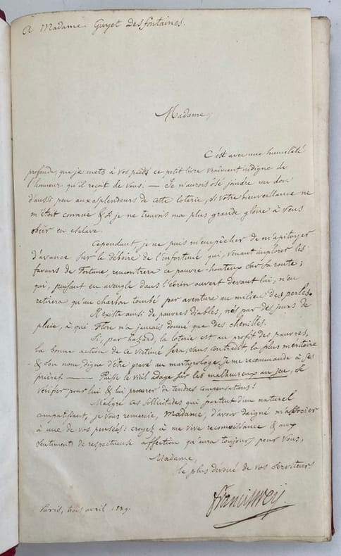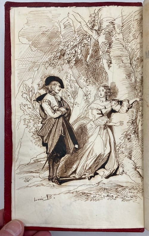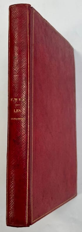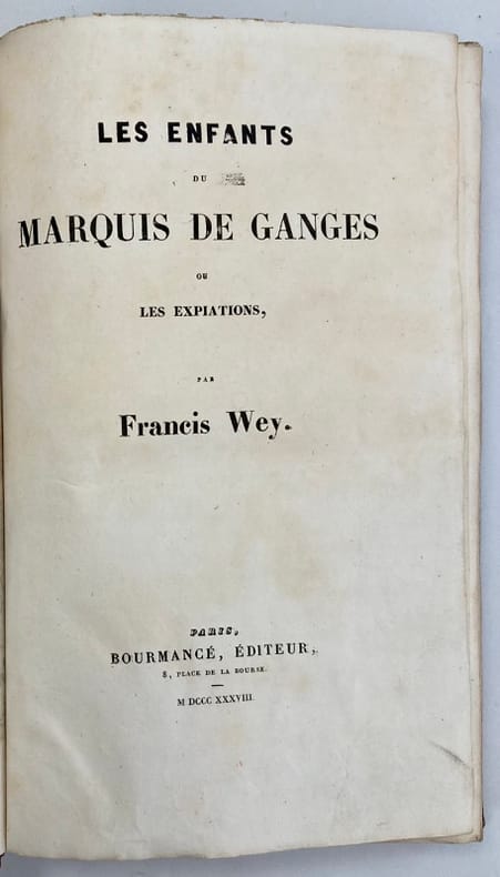 Edition originale de ce récit sur le destin tragique d’une famille marquée par le crime et les passions et sur laquelle une fatalité morale s’abat telle une chape de plomb. Exemplaire unique enrichi de 2 pièces reliées en début d’ouvrage:- 1 dessin original à l’encre à pleine page représentant une scène galante. Signé Louis B., vraisemblablement du dessinateur Louis Boulanger (signatures similaires) qui fréquentait le même milieu artistique/littéraire que l’auteur et partageait la même passion pour la photographie.- 1 lettre manuscrite à l’encre, sur un même papier fin que le dessin, signée, datée du 3 Avril 1839, de l’auteur à Emma Guyet Desfontaines. Il lui fait part de toute son admiration, de son dévouement, et la remercie de l’interêt porté à son livre. En effet, cette femme influente autant dans le milieu artistique que littéraire, elle-même auteur, chanteuse, musicienne et même sculptrice, recevait dans ses salons mondains nombre de personnalités comme Alexandre Dumas, Charles Nodier ou encore Hector Berlioz…Elle avait le soucis de promouvoir et de soutenir les jeunes talents comme Francis Wey.Reliure tachée et légèrement frottée. Quelques pâles rousseurs.