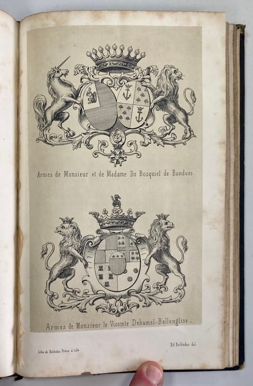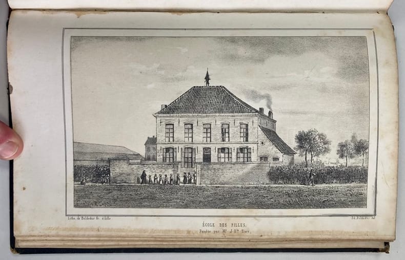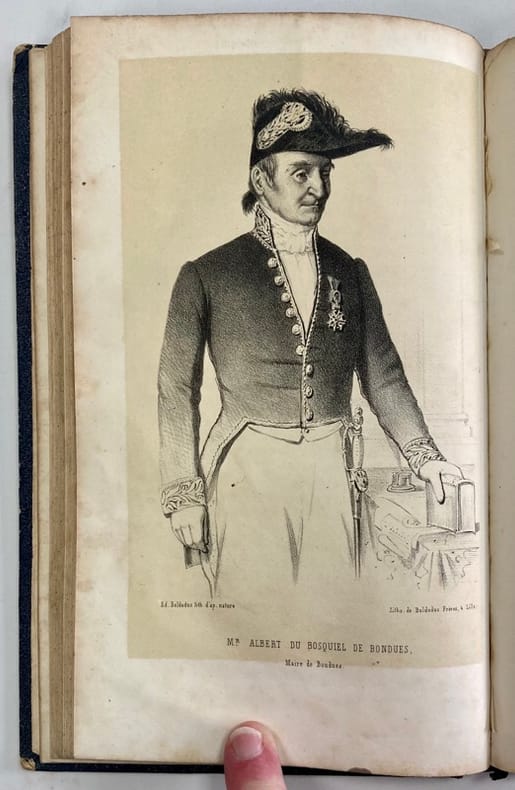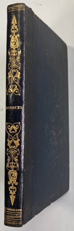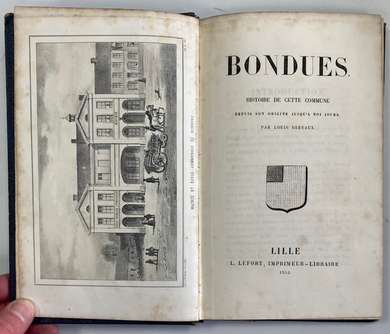 Edition originale peu commune de cet essais historique sur la ville de Bondues, petite agglomération des environs de Lille, illustrée de 10 gravures hors-texte et d’1 tableau de statistiques dépliant.L’auteur, qui n’en trouvait pas mention en-deçà du XIème siècle dans les ouvrages historiques, a tenté de retracer son passé depuis l’invasion romaine.Rousseurs, reliure frottée. Déchirure sans manque à la base du tableau dépliant.