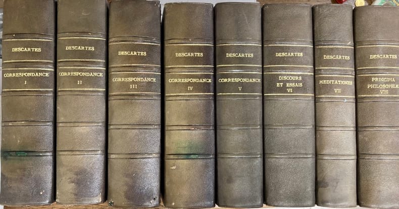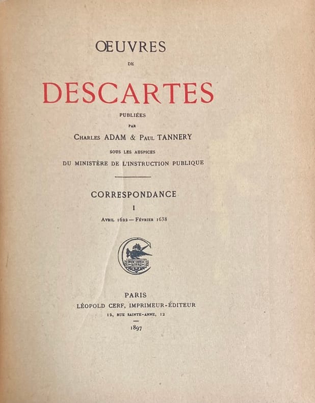 Edition officielle des oeuvres de Descartes publiées par Charles Adam et Paul Tannery, sous les hospices du ministère de l’instruction publique.La série est constituée des Correspondances (I-V) ; des Discours de la méthode et Essais (VI) ; Méditationes des prima (VII) ; Principia philosophie (VIII) ; Méditations et principes, avec la traduction française de L.C. d’Albert (IX) ; Physicomathematica Compendium Musicae, Regulae ad directionem ingenii, Recherche de la vérité, Supplément à la correspondance (X) + 1 planche dépliante Le Monde, description du corps humain, Passions de l’âme, Anatomica (XI) illustré de 20 planches dépliantes ; Vie & livres de Descartes ; études historiques par Charles Adam. Supplément. (XII) Un volume supplémentaire, publié à Oxford 16 ans plus tard, en 1926, comprenant la correspondance entre Descartes et Huygens, n'est pas présent. Dos passés. Mouillure sur la tranche du T.I. Quelques rousseurs aux T.X et XI.