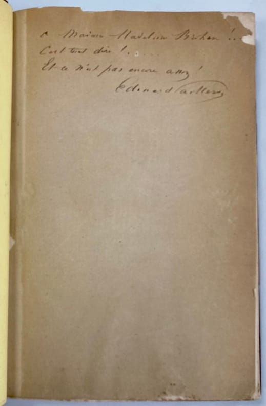 Edition originale de cette comédie en 3 actes représentée pour la première fois à la Comédie Française le 25 Avril 1881, qui est une satire des salons littéraires.Envoi autographe signé : « à Madeleine Brohan, c’est tout dire!… Et ce n’est les assez! Edouard Pailleron».Madeleine Brohan joua, dans cette pièce, le rôle de la Duchesse de Réville.Couvertures abimées. Page de l'envoi jaunie et avec petits manques. Pâles rousseurs sur les 4 premiers feuillets.