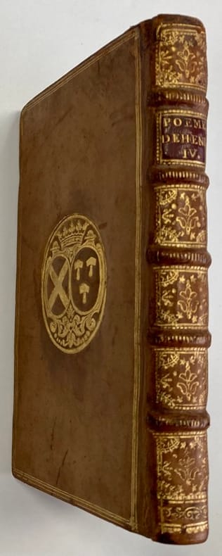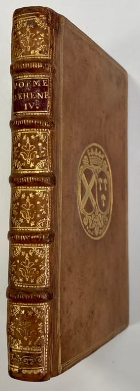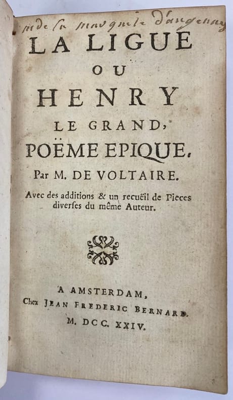 Seconde édition de ce recueil de 9 chants de Voltaire, paru un an après l’original, publié par l’Abbé Desfontaine à qui sont attribués 2 vers de la p.72: « Et la religion, que la science honore, Par le progrès des arts mieux triompher encore ».Il sera publié par Voltaire en 1728 sous le titre « La Henriade ».Reliure aux armes de Marie-Françoise de Mailly du Breuil, marquise d’Angennes, avec son nom manuscrit sur la page de titre.Ex-dono manuscrit daté de 1831.Reliure légèrement frottée. Petites restaurations à la coiffe supérieure. Quelques rousseurs.OHR IX, 939.