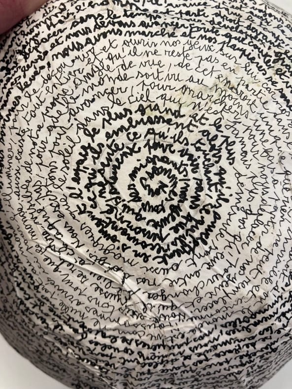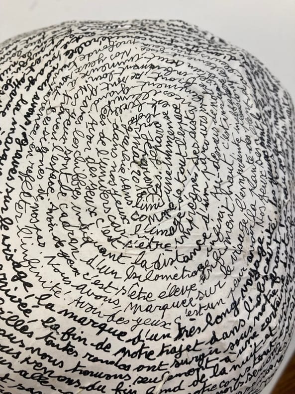 Sphère entièrement recouverte d’un texte manuscrit à l’encre, organisé en mouvements spiralés, avec un fragment de papier en braille contrecollé, datée et signée par le sculpteur et auteur français J.L. Parant (1944-2022).Artiste à l’univers singulier basé sur la vision et le mouvement, J.L. Parant développe depuis les années 1970 un travail autour de la forme sphérique, ses « boules », et de l’écriture comme matière.A la croisée de la poésie et de la sculpture, il évoque notre voyage terrestre en éternel migrant par le mouvement perpétuel des yeux. L’introduction d’un fragment de papier en braille, qui fait l’originalité de cette oeuvre, renforce sa réflexion sur la perception du monde par la vision et le toucher, lui qui déclarait faire des boules « pour aller là où les yeux ne vont pas ». Réalisée à l’automne de sa vie, elle traduit une recherche perpétuelle et sans fin de l’artiste.« Je fais des boules pour pouvoir entrer dans mes mains et aller là où mes yeux ne vont pas, où je ne suis jamais allé avec eux, où je ne me rappelle pas avoir été visible. Pour aller là dans la matière, dans mon corps sur la terre » fabricant de boules et de textes sur les yeux.Il exposera ses oeuvres au Centre G. Pompidou ou encore au Musée d’art moderne de Paris.