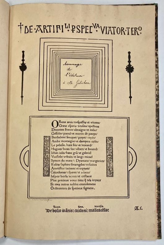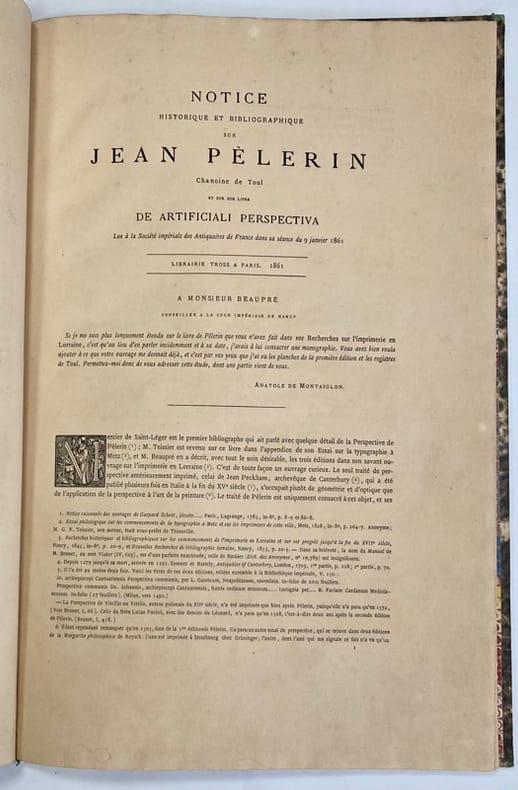 Rare édition originale de cette notice de Montaiglon sur la perspective de Viator (Jean Pèlerin) en format in-4, illustrée en début d’ouvrage de 2 fac-similés de l’édition de Toul de 1521.Inscription manuscrite sur le fac-similé de la page de titre: « Hommage de l’éditeur à Mr Galichon ».Reliure frottée. Petit accroc à la coiffe supérieure. Quelques rousseurs sur les gardes.