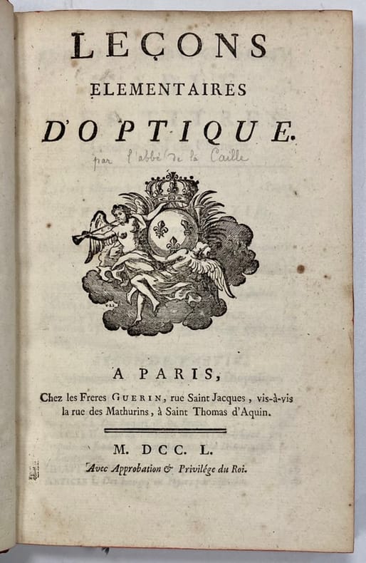 ---- BEL EXEMPLAIRE AUX ARMES DE LOUIS XV pour le collège royal de Toulouse ---- Nouvelle édition REVUE, CORRIGEE ET AUGMENTEE (d'un traité de perspective) ---- "... LA CAILLE was named to the chair in mathematics once held by Varignon at the Collège Mazarin. In May 1741, in recognition of his work on the meridian and his resolution of the controversy over the shape of the earth, he was received into the Academy of Sciences as an adjoint astronomer. Once again in residence in Paris, he took his professorial duties seriously publishing Leçons élémentaires de mathématiques. In succession other elementary texts followed : ... Leçons élémentaires d'optique (1756). The prompt translations into latin, spanish and english were an eloquent compliment to his books which was destined to go through several french editions as well...". (DSB VII pp. 542/543) ---- "LA CAILLE was one of the first french scientists to come out in favor of NEWTON's theories" ---- Propriétés générales de la lumière - Propriétés de la lumière par rapport à la vision et aux couleurs - La catioptrique et la dioptrique - De la vision - Des télescopes et des microscopes - Des obstacles qu'on rencontre dans la construction des télescopes et des microscopes - De la perspective - De la perspective des ombres - Des ombres solaires ou lunaires - Différens problèmes sur les ombres - etc**8768/ARB6