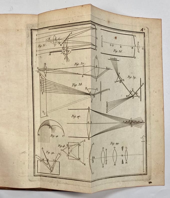 Edition originale, illustrée de 4 planches dépliantes. L'abbé La Caille fut un des plus fameux astronome du XVIIIème et cet ouvrage a contribué à diffuser de manière claire et pédagogique les bases de l’optique.Mors restaurés.