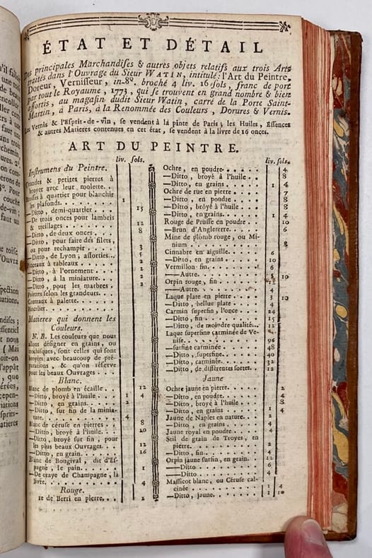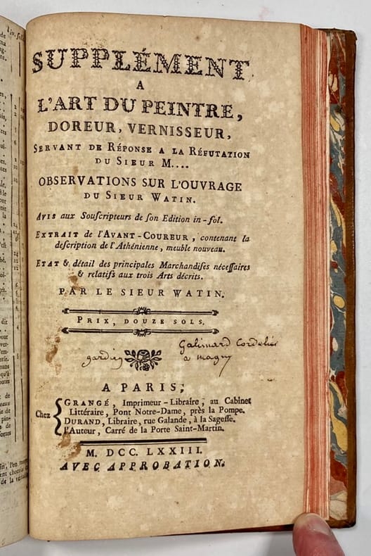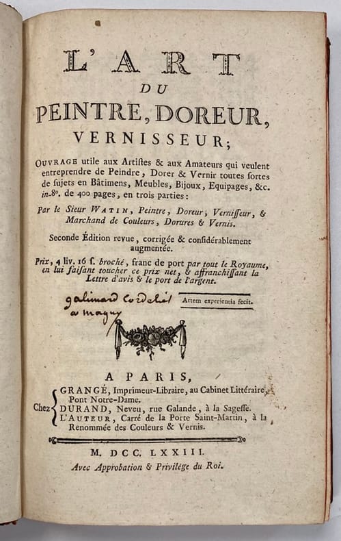 Seconde édition, revue, corrigée et considérablement augmentée, la première ne présentant que l'art du vernisseur; le peintre et le doreur étant traités de façon accessoire.A la suite sont reliés : - Etat et détail des principales marchandises traités dans l'ouvrage, et qui se trouvent au magasin de l'auteur. - Supplément à l'Art du peintre, doreur, vernisseur... Mention manuscrit sur les pages de titre : "Galimard, cordelier à Magny". Pour tout savoir sur les secrets des peintres, du vernis de Chine... Infimes rousseurs.