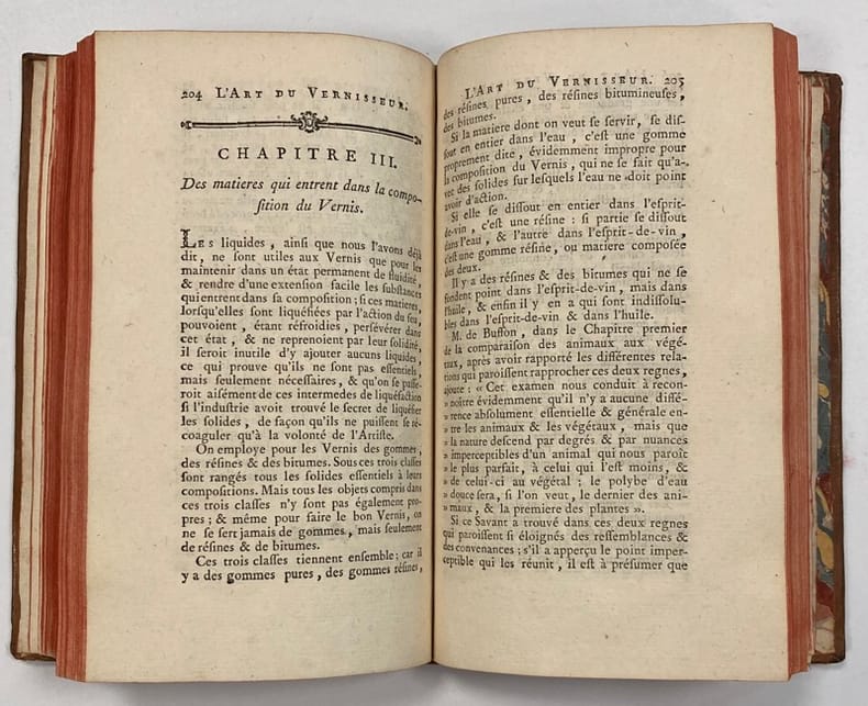 QUATRIÈME ÉDITION, revue, corrigée et augmentée de ce FAMEUX TRAITÉ à l'usage des artistes et amateurs par le peintre, doreur, vernisseur et marchand de couleurs, dorures et vernis, Jean-Félix WATIN (né en 1728). Dans cet ouvrage divisé en TROIS PARTIES, il détaille tout d'abord la composition des couleurs, le moyen de les fabriquer, de la détrempe, de la peinture à l'huile, etc. puis dans "L'Art du doreur", la dorure à l'or, à l'huile, la manière de bronzer les fers, de nettoyer les vieilles dorures, etc. et enfin dans "L'Art du vernisseur", il explique l'emploi des vernis, la manière d'imiter les laques, de polir, lustrer, rafraîchir et détruire les couleurs et vernis, etc. On trouve à la suite le "Mémoire sur le vernis de la Chine" (pages 326 à 346) du jésuite passionné de botanique Pierre Nicolas Le Chéron d'Incarville (1706-1757) qui séjourna en Chine de 1740 à sa mort, et qui donne de nombreux détails sur « l'arbre de vernis », la préparation des différents vernis, le travail, l'application et la peinture du vernis, etc. TRÈS BEL EXEMPLAIRE conservé dans une reliure d'époque intacte, au corps d'ouvrage frais. FINE COPY. PICTURES AND MORE DETAILS ON REQUEST.