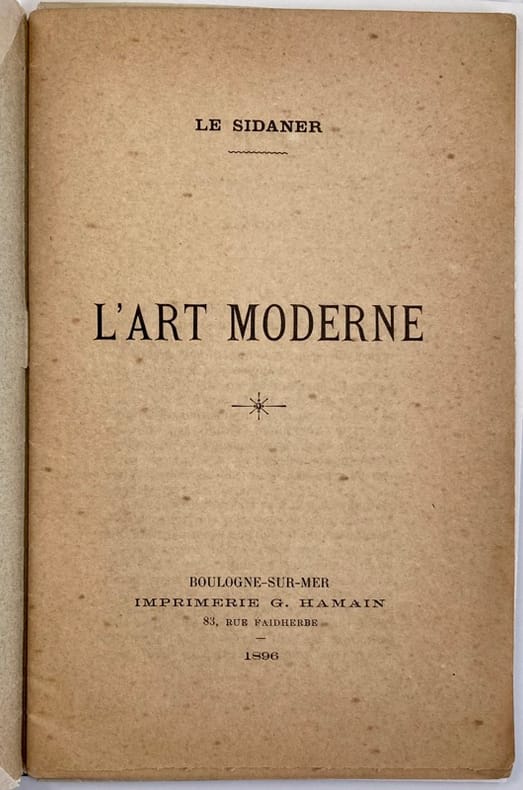 Conférence faite à Boulogne sur mer par le peintre post-impressionniste Le Sidaner, originaire des Flandres françaises, sur la naissance du courant réaliste avec des peintres comme Courbet, Millet, Monet, ou encore le peintre boulonnais Jean Cazin.Le Sidaner exprime une vision personnelle et poétique de la modernité, à contre-courant des tendances dominantes, et annonce une évolution majeure vers une peinture plus intérieure.Brochage insolé. Fragment de timbre contrecollé sur la couverture.