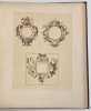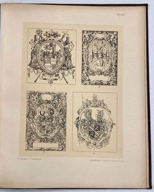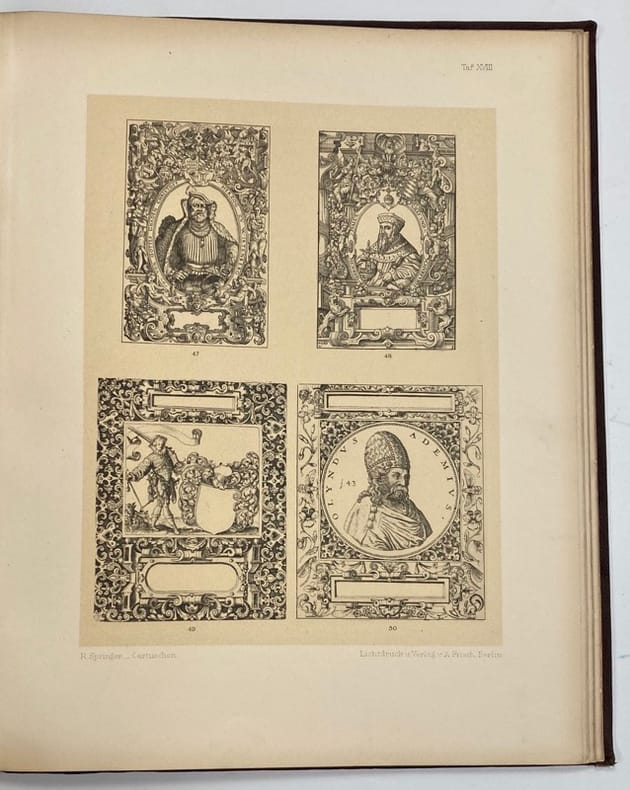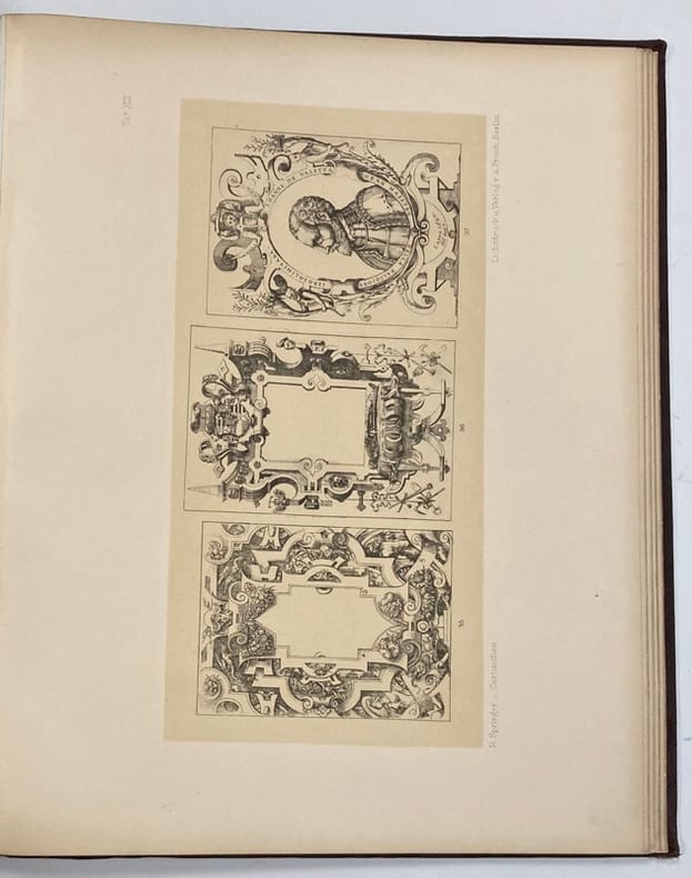 Rare recueil de 100 modèles de cadres ornementaux répartis sur 33 planches, sélectionnés par Rudolf Springer, et précédés d’un texte introductif en langue allemande.Ces planches, pour la plupart reproduites en phototypie (lichtdruck), représentent des « cartouches » destinées à l’ornement de titres, d’armoiries, ou encore d’éléments d’architecture, et font état d’un panel de styles historiques très différents: baroque, rococo, renaissance…Cet ouvrage, conçu avant tout comme un outil pédagogique, se voulait utile aux architectes, graveurs, illustrateurs, et autres artisans…Ex-libris « Stern, graveur ».Reliure frottée. Manque aux coiffes, mors fendus. Gardes roussies.